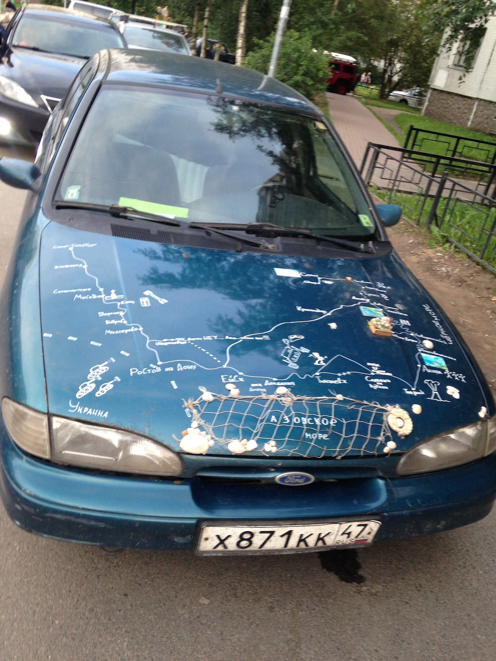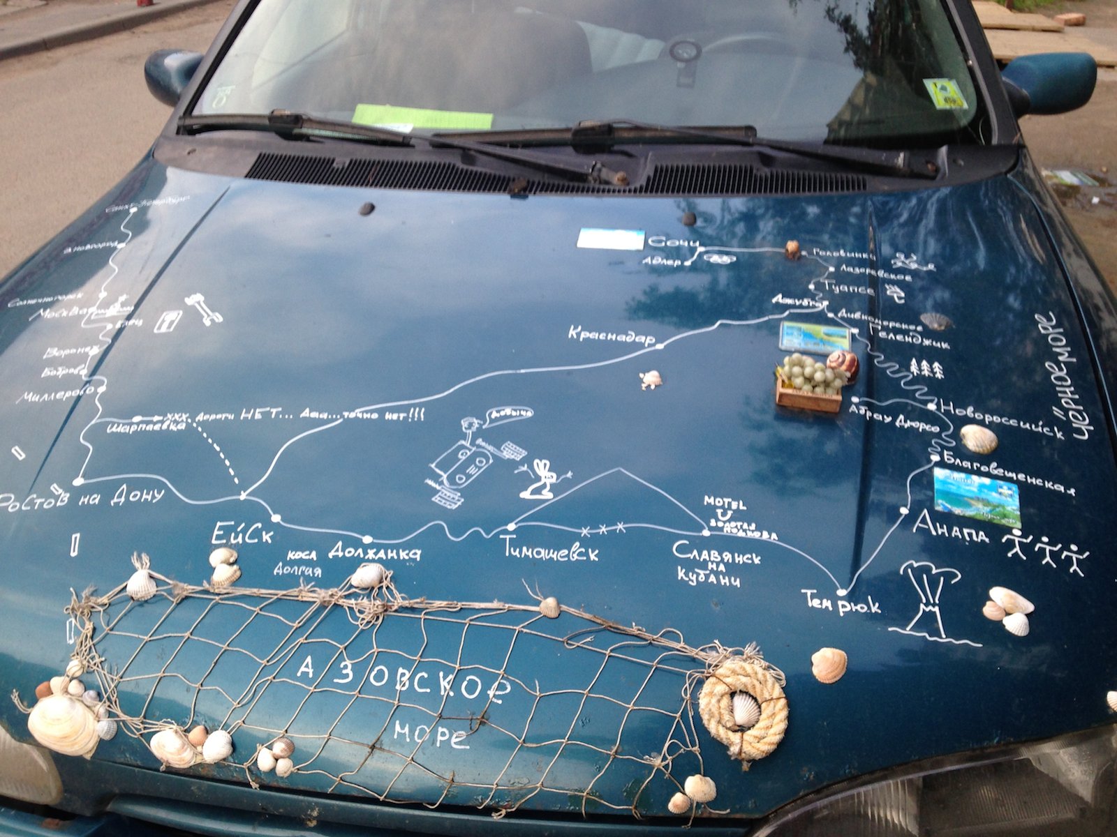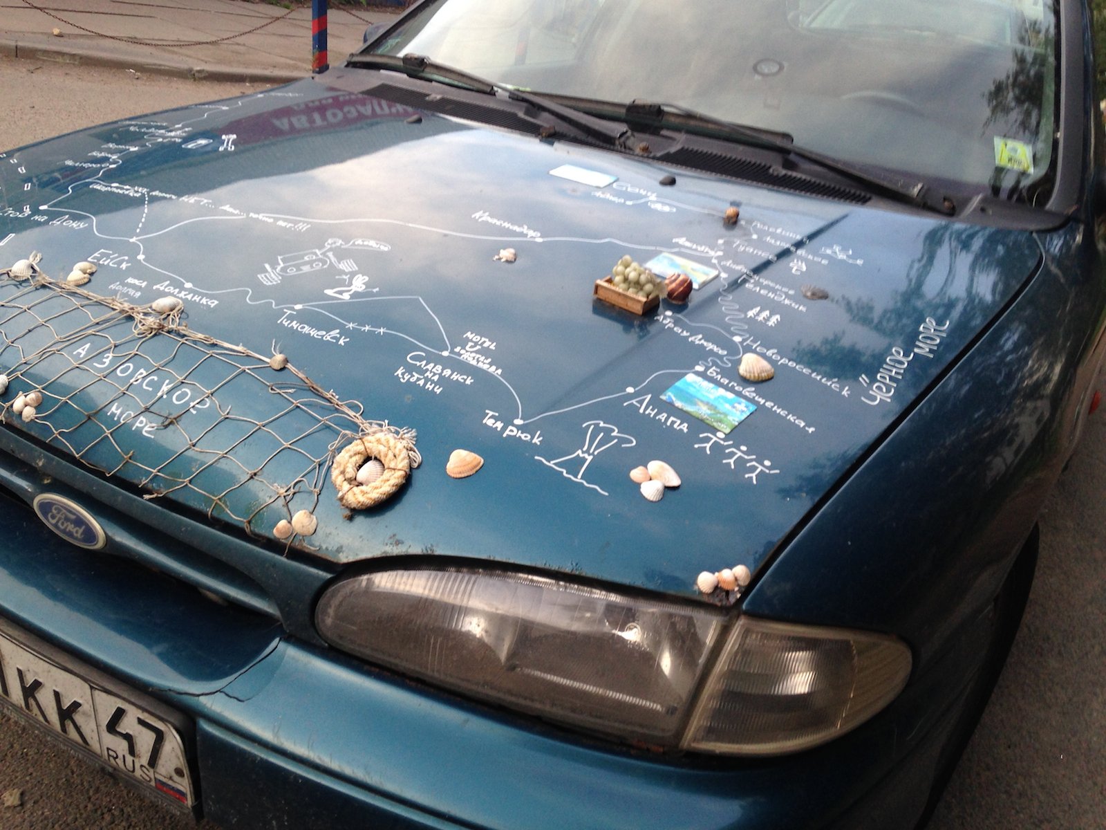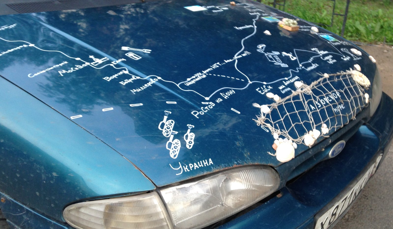 Автор нанес на капот автомобиля Ford Mondeo sedan схематическую карту региона Азовского бассейна и украсил некоторые точки на этой карте предметами, ассоциирующимися с географическими точками на ней, а именно: уже упомянутой выше рыболовецкой снастью, барельефом виноградной веточки и морскими раковинами, возможно, извлеченными из этого самого Азовского моря. Автор неизвестен. Фото usedcars.ru