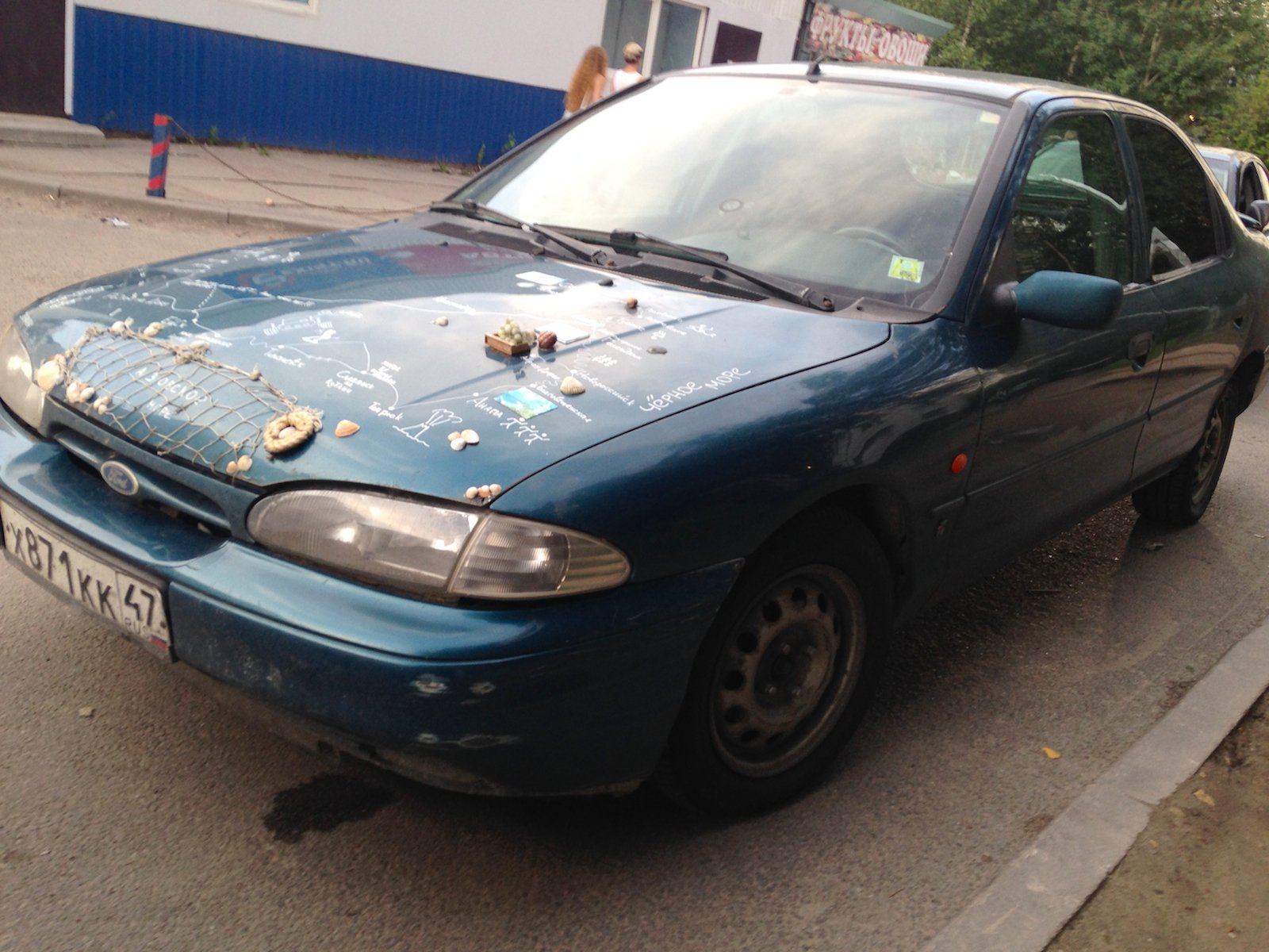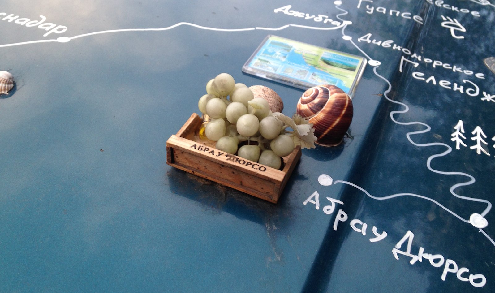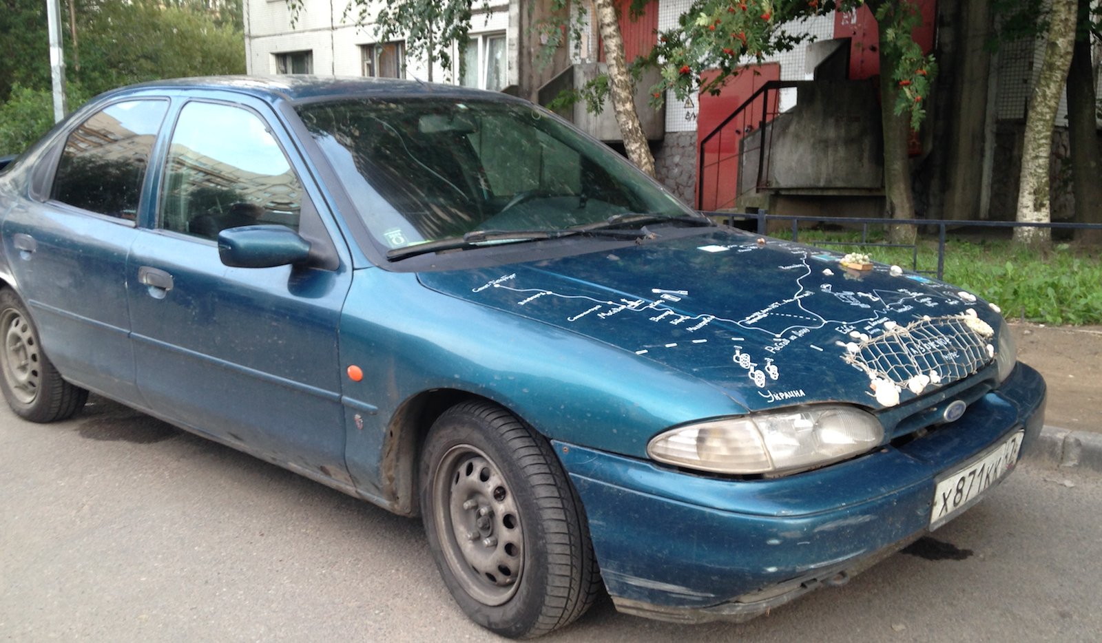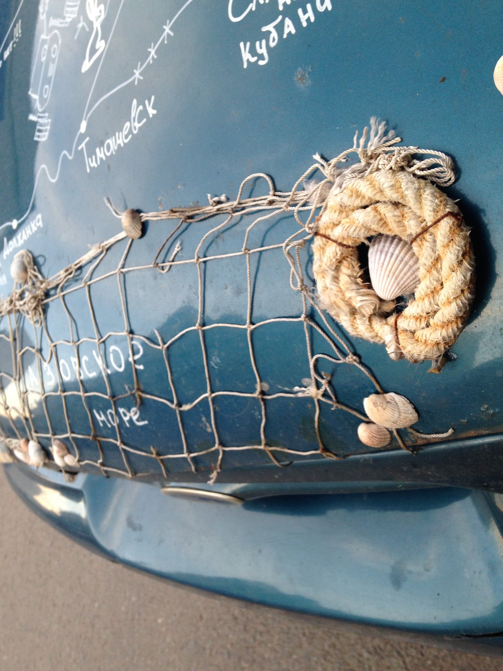 Автор нанес на капот автомобиля Ford Mondeo sedan схематическую карту региона Азовского бассейна и украсил некоторые точки на этой карте предметами, ассоциирующимися с географическими точками на ней, а именно: уже упомянутой выше рыболовецкой снастью, барельефом виноградной веточки и морскими раковинами, возможно, извлеченными из этого самого Азовского моря. Автор неизвестен. Фото usedcars.ru