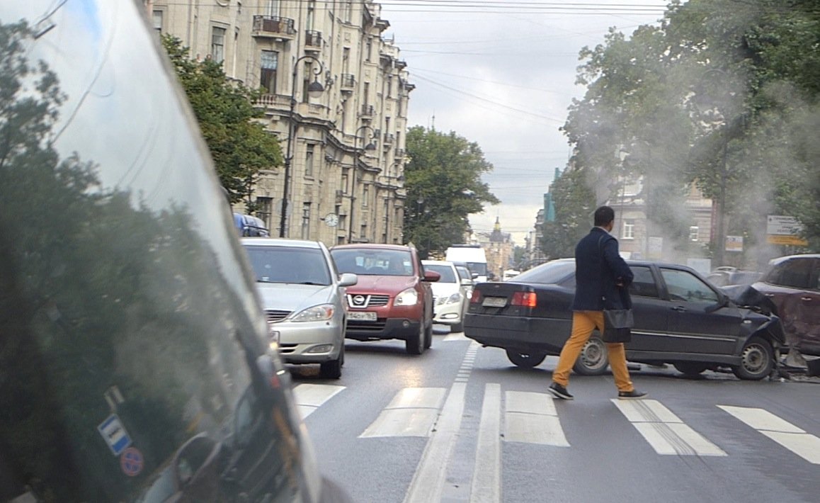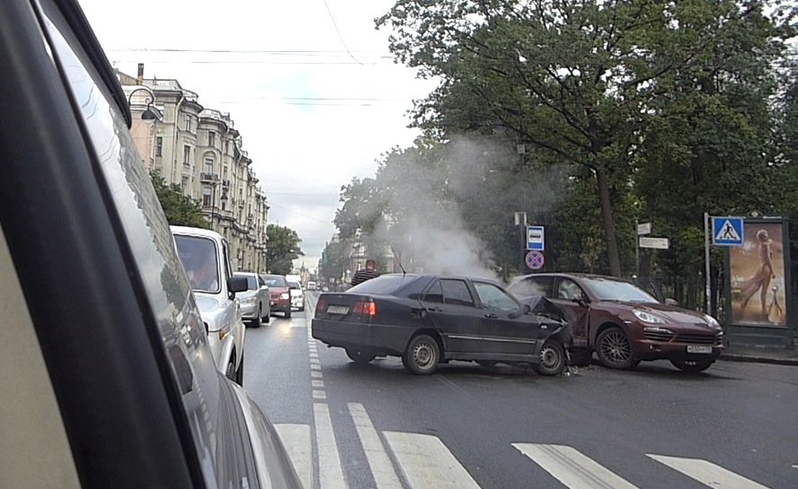 Девушка, водитель автомобиля Porsche Cayenne, непринужденно разговаривая по телефону, одной рукой (сам все видел лично!) управляя внедорожником совершила маневр левого поворота с Каменноостровского проспекта на Большую Монетную улицу не убедившись в безопасности поворота. Ехавший здесь седан Seat Toledo? остановиться не успел да и не мог и врезался на приличной скорости в левый бок "Порше". Небольшой клип снят в ту же минуту когда и произошло ДТП. Дальнейшее развитие событий неизвестно. Однозначно ожидаем огромную пробку по Каменнооостровскому проспекту. Видел в зеркало заднего вида что оба водителя вышли из своих машин самостоятельно.
