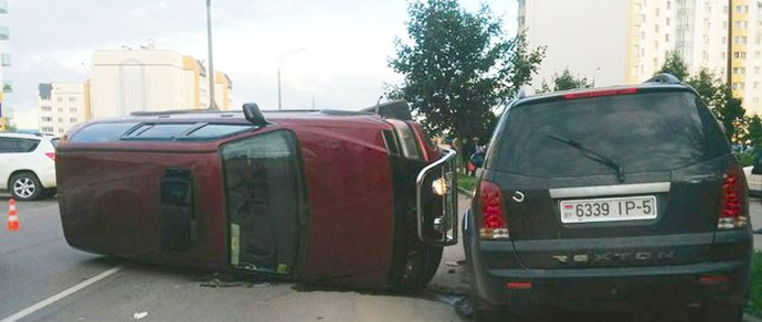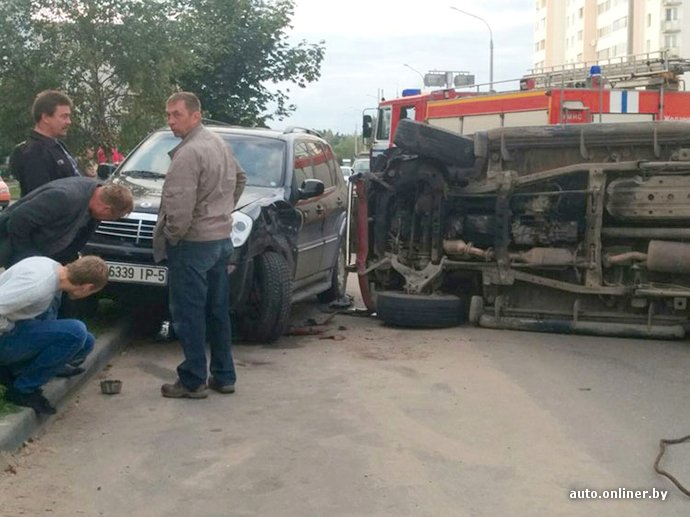 ДТП в Белоруссии - внедорожник Опель Фронтера врезался в припаркованный Ssang Yong Rexton и опрокинулся. Два нетрезвых молодых человека из "Опеля" разбили лбы о лобовое стекло, однако, выбрались из машины и попытались убежать с места ДТП.