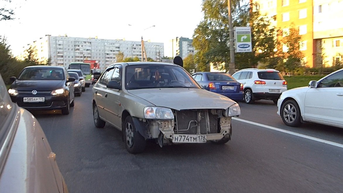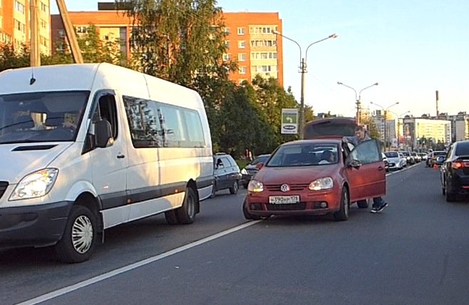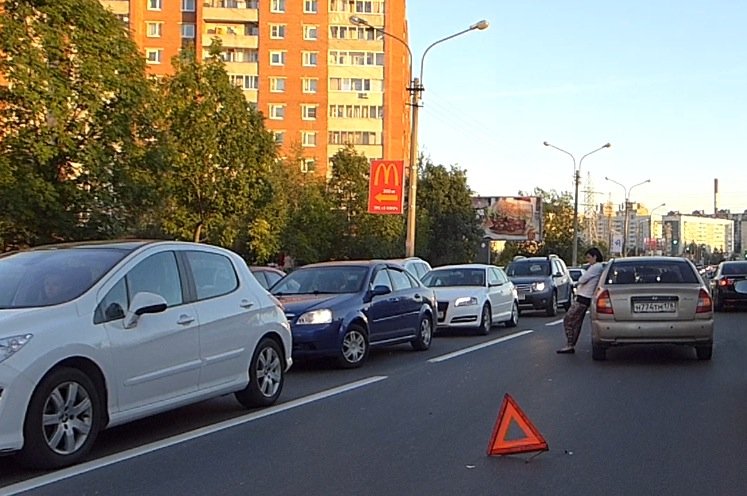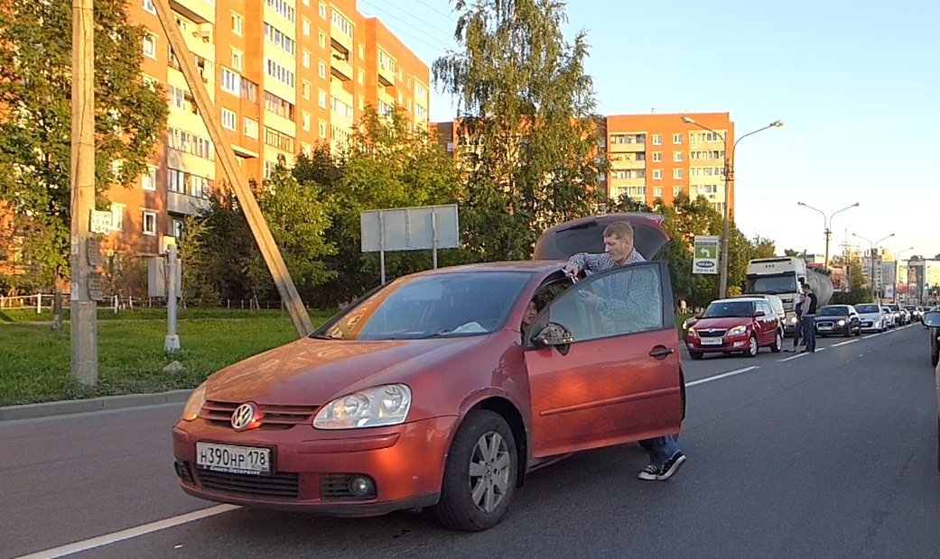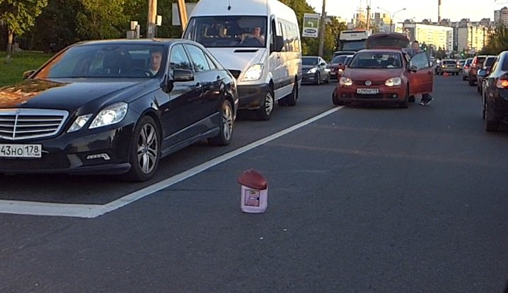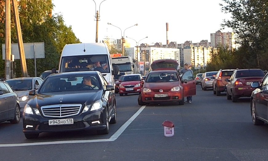 Непонятная авария с тремя легковушками случилась вечером в субботу на Планерной улице (перекресток с Долгоозерной). Автомобиль Volkswagen Golf стоит на полосе встречного движения и видно, что у него разрушена передняя подвеска и правое колесо вывернуто наружу. На пустой канистре, стоящей на асфальте в качестве предупреждающего о ДТП знака, лежит пластиковая защита от правого внешнего водительского зеркала Фольксвагена.