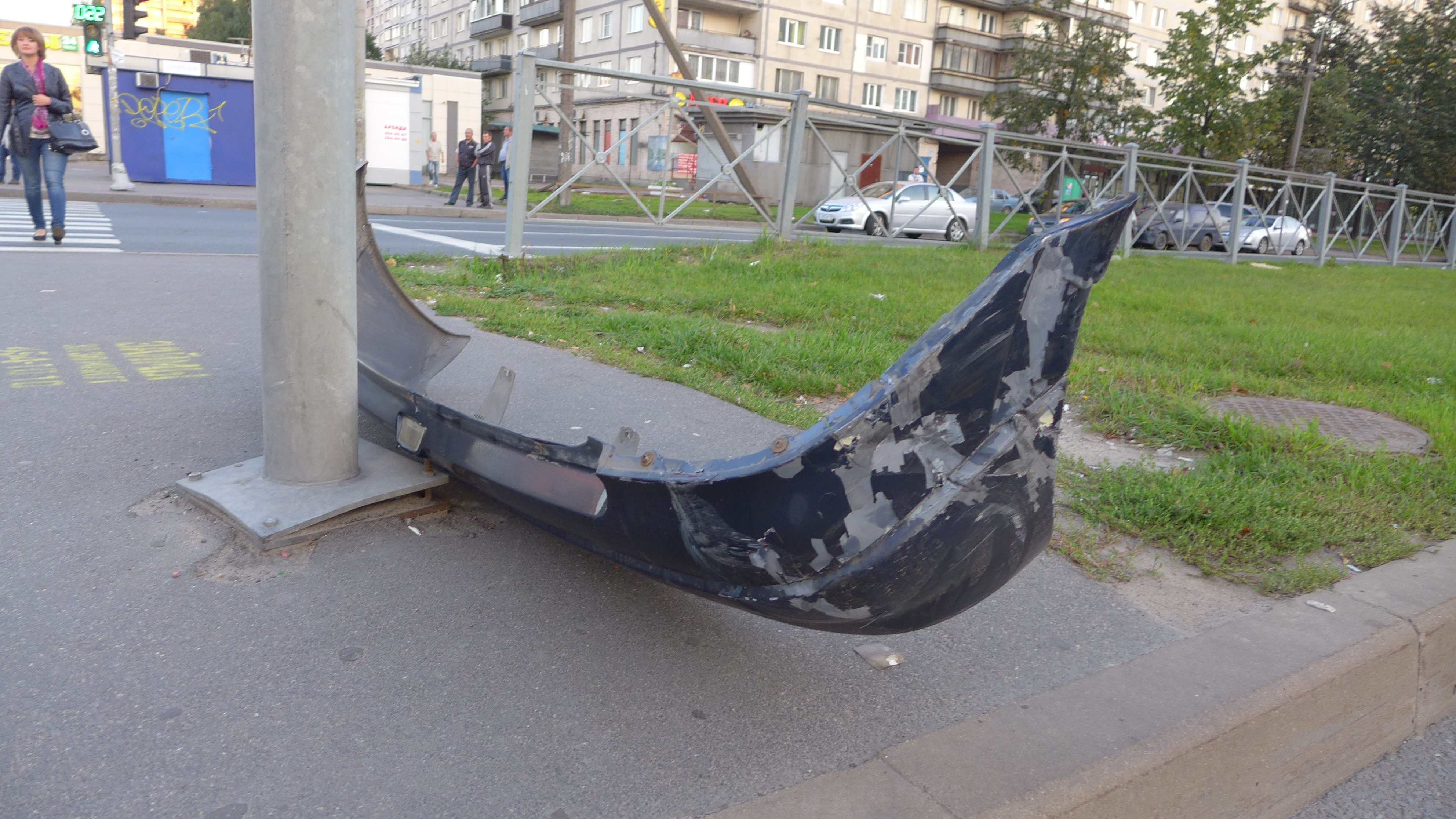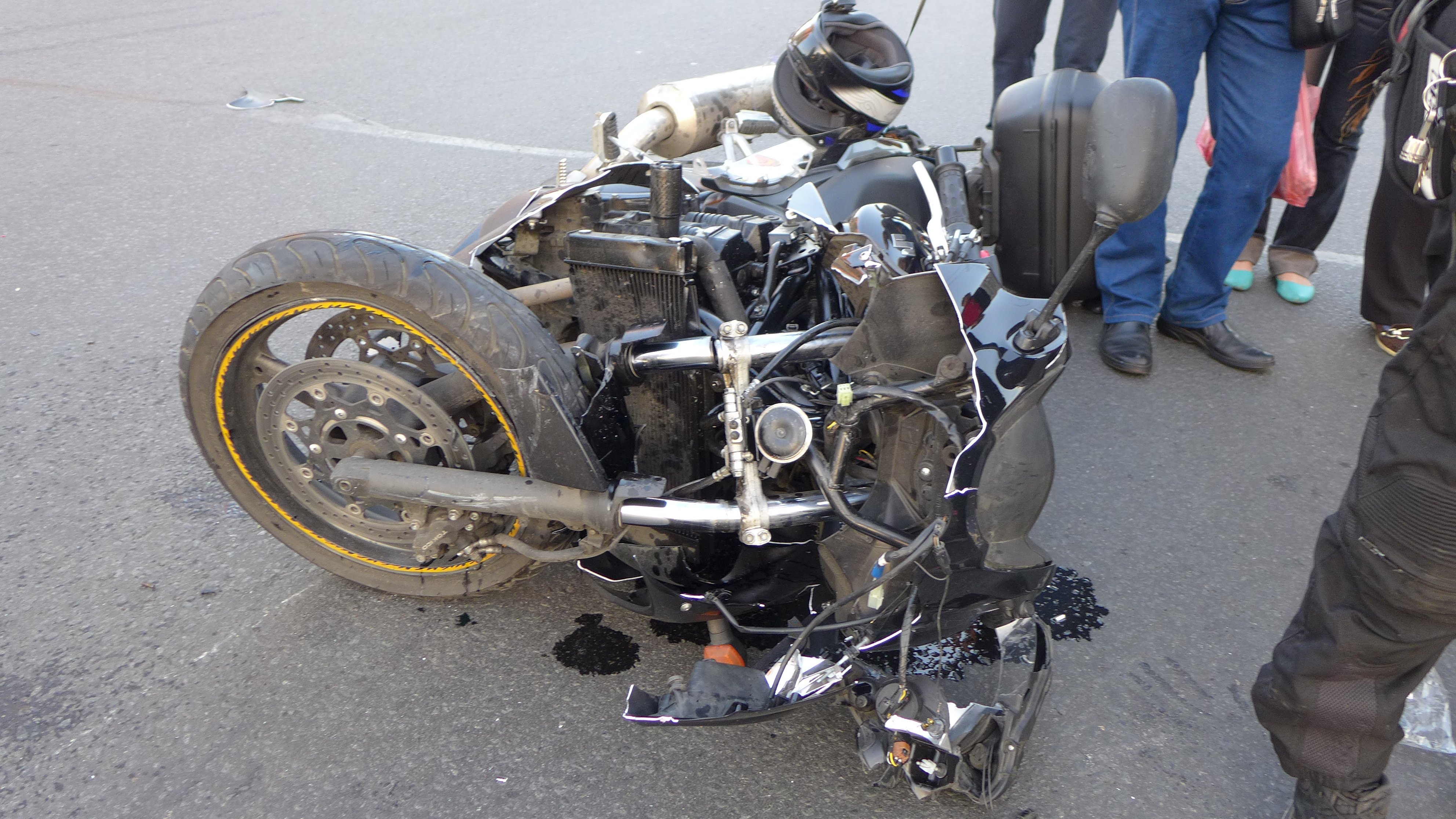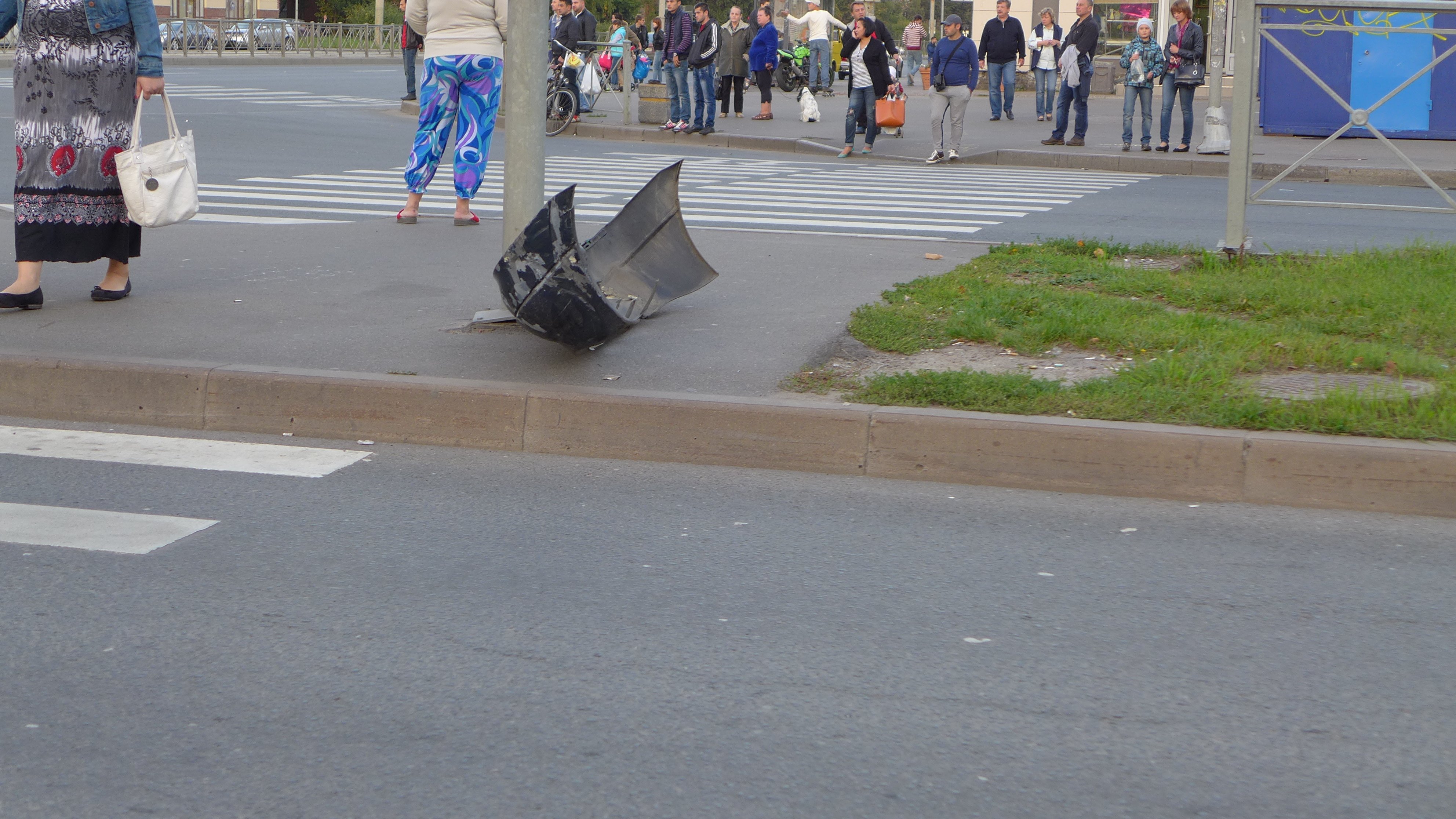 Мотоцикл отлетел от места удара на большое расстояние. Весь перекресток оказался усыпаным обломками пластиковых деталей мотоцикла и частично легкового автомобиля. Мотоцикл получил очень сильные повреждения элементов передней части, восстановление которых, скорее всего, невозможно. В свою очередь, у иномарки от удара отвалился задний бампер (без номерного знака).