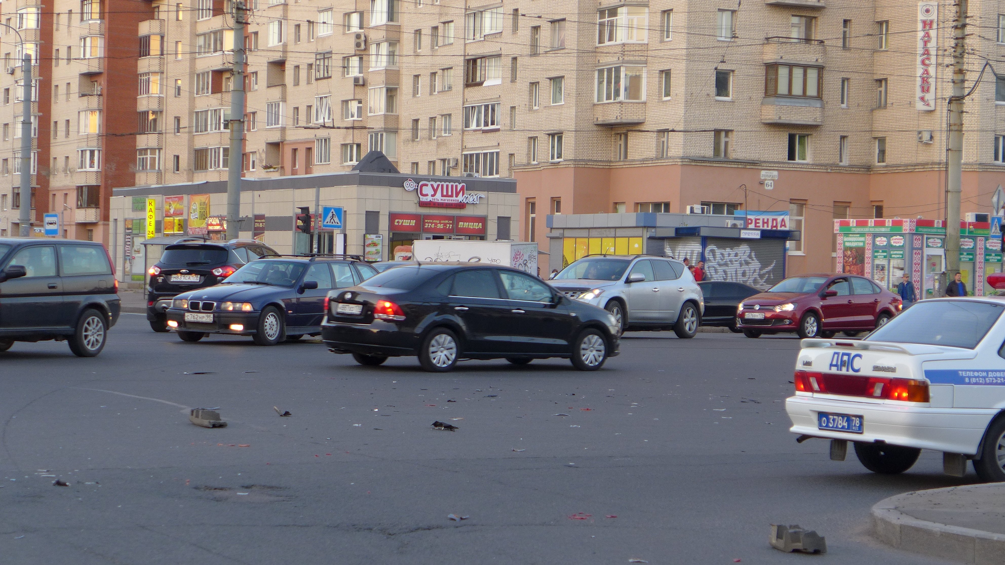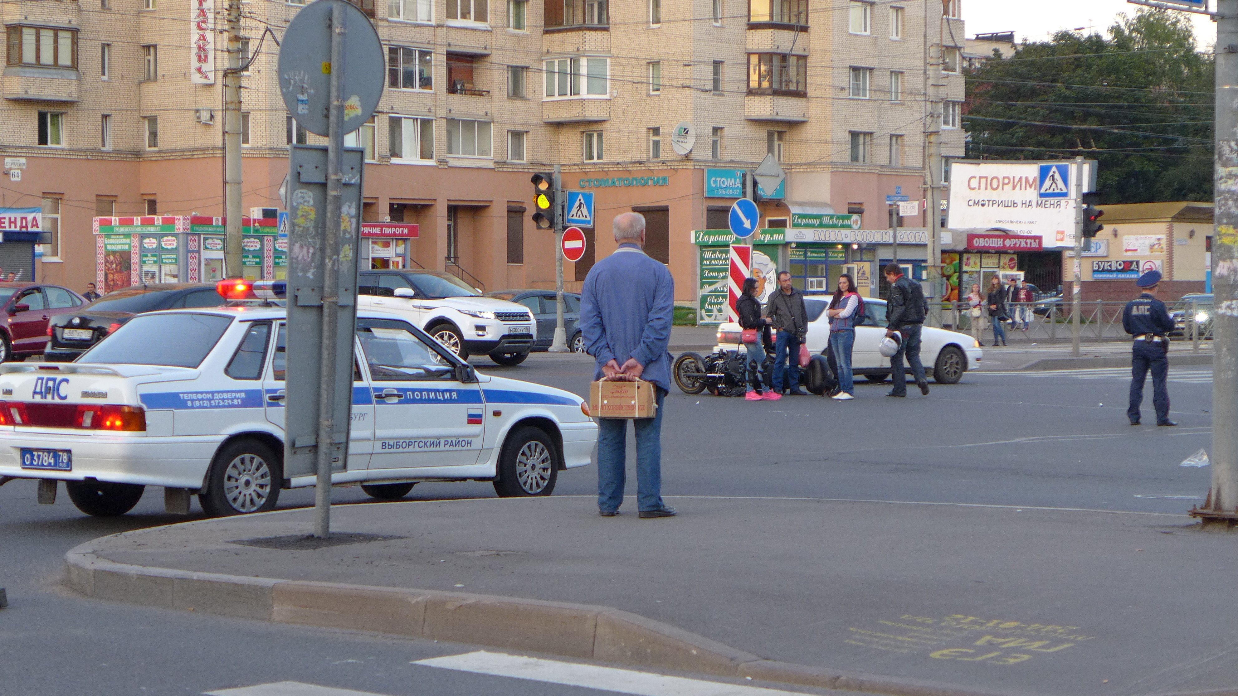 Мотоциклист был одет в специальную мото-экипировку, но все-же получил травмы средней тяжести, что и не удивительно если судить по повреждениям мотоцикла. Пока ходит сам. На момент съемки находился в патрульном автомобиле Выборгского ГИБДД и отвечал на вопросы инспектора полиции. Обстоятельства произошедшего устанавливаются. Мотоциклисты очень хотят поймать для разговора водителя, уехавшего с места ДТП.