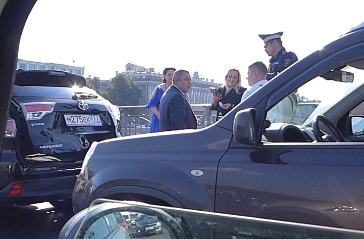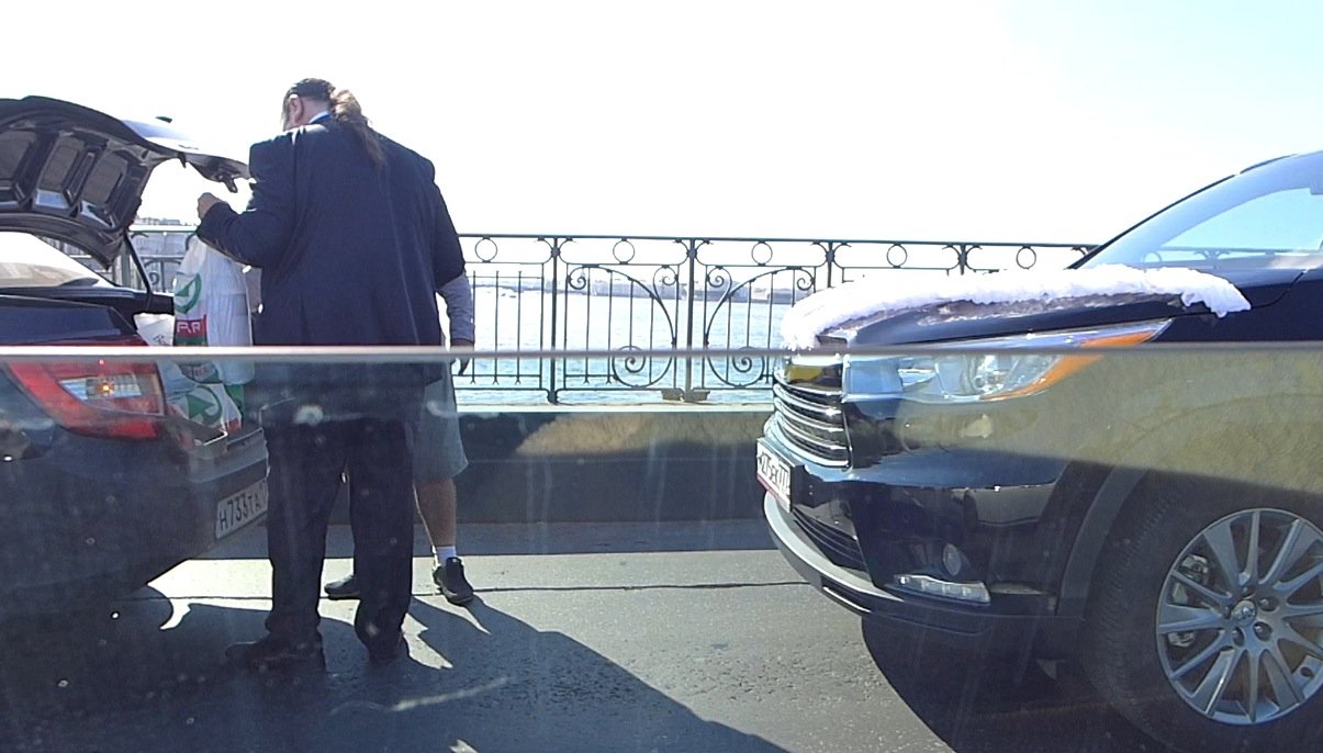 Три автомобиля столкнулись в режиме "паровозика" на Троицком мосту во второй половине дня вторника 9 сентября. Toyota Highlander из свадебного кортежа (с украшением из белых лент на капоте), врезался в седан (предположительно, китайского производства). Ну а в "Тойоту" врезался ехавший сзади Nissan X-Trail.