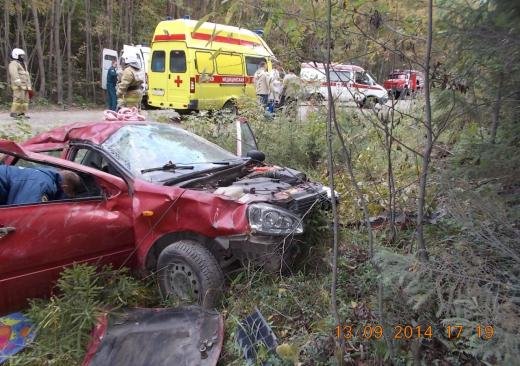 На место ДТП прибыли пожарные и местное МЧС. Машина получила катастрофические повреждения кузова. Подробности будет выяснять местное ГИБДД. Сведений о пострадавших пока нет. ДТП случилось 13-ого сентября около 16-00
