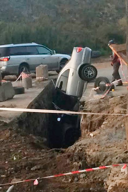В Владивостоке в районе Тихая Бухта в траншею свалился легковой автомобиль. Машина вопреки всем законам физики, торчала в узкой щели между плитами в вертикальном положении.