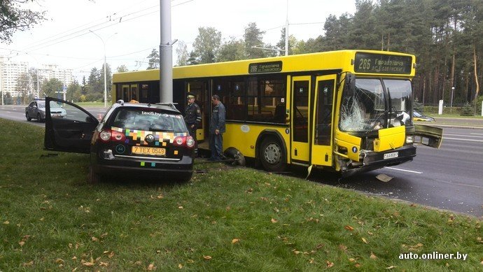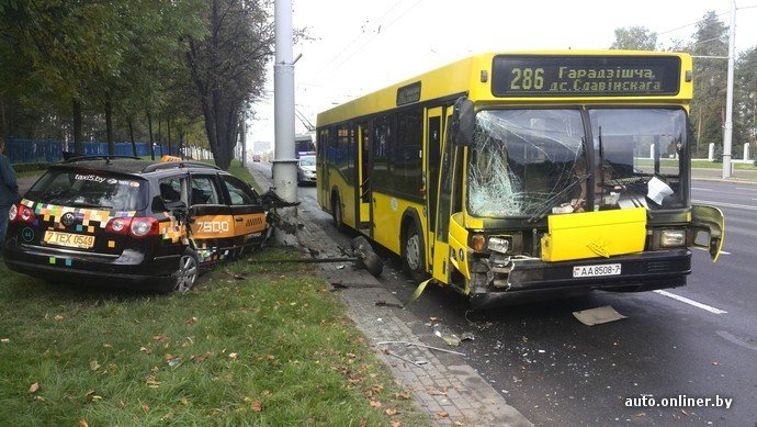 Как пишут местные СМИ, предположительно, таксист заснул за рулем. Люди в автобусе не пострадали. Таксист, по счастливой случайности, серьезных повреждений не получил, однако был увезен в больницу. Автор: Роман Протасевич.