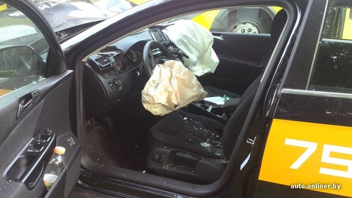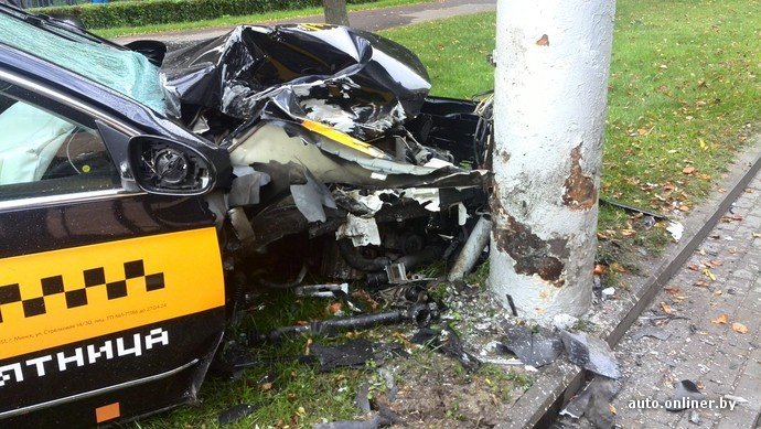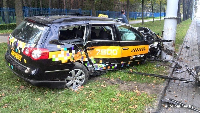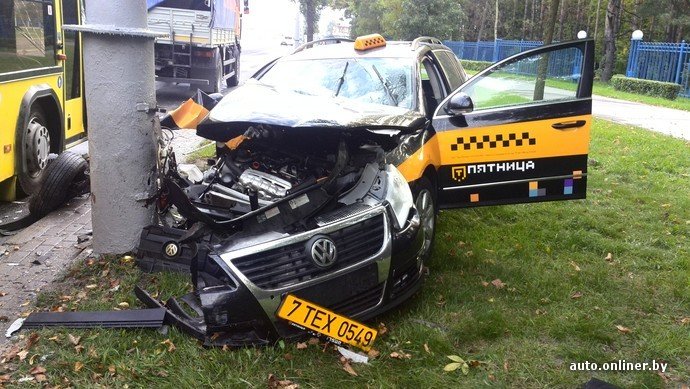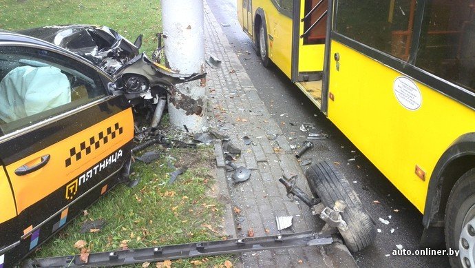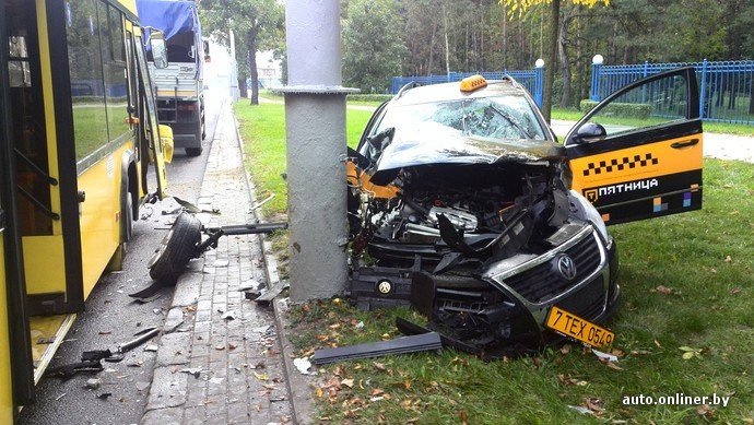 В Минске на проспекте Независимости рано утром в воскресенье произошло серьезное ДТП с участием рейсового автобуса и такси (Volkswagen Passat). По словам свидетелей произошедшего, такси выехал на полосу встречного движения, столкнулся с ехавшим здесь автобусом, после чего отлетел в сторону и врезался в фонарный столб.