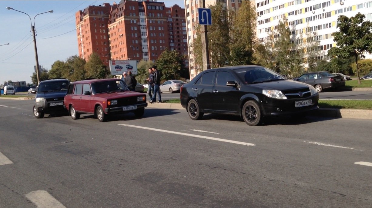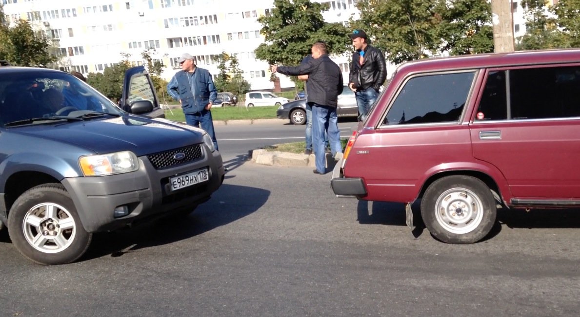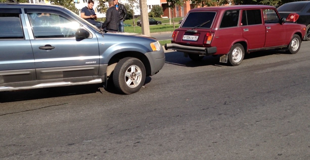 Авария оказалась несерьезной, но водители решили вызвать ГИБДД на место происшествия. Участвуют Ford Escape DFP 2104 и китайский Geely. Никто не пострадал.