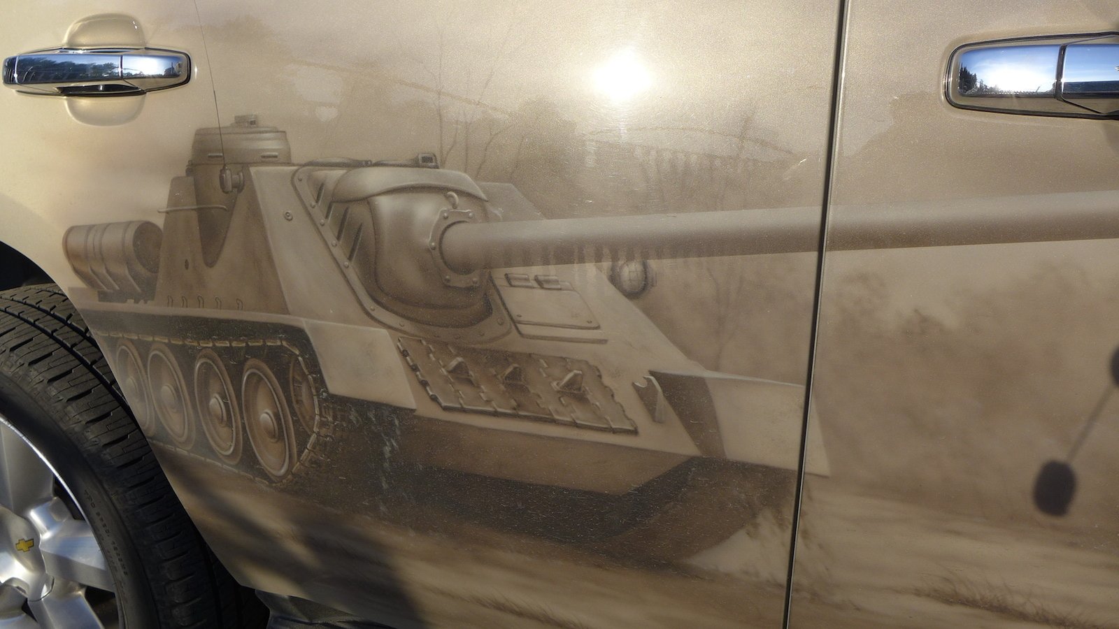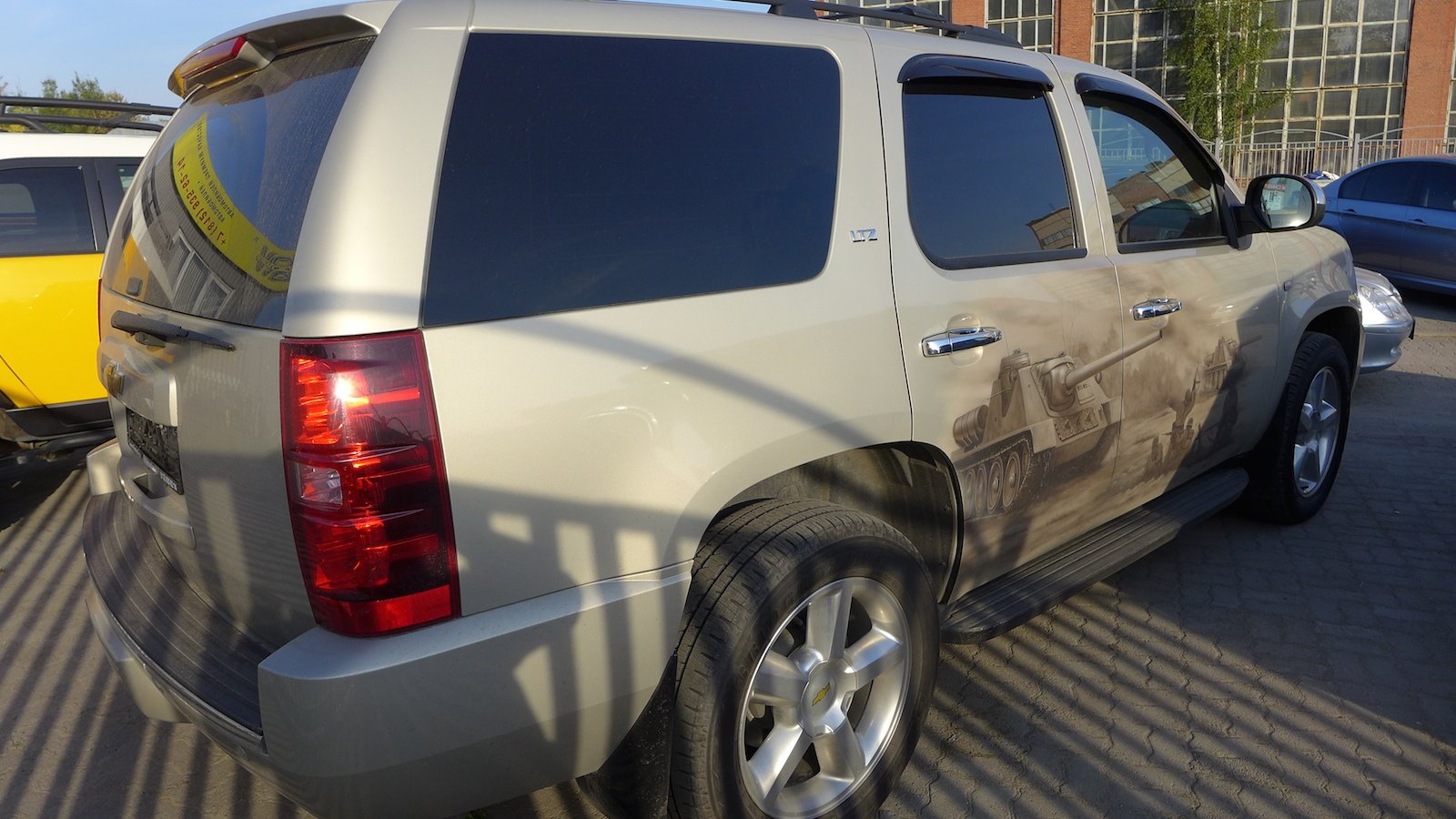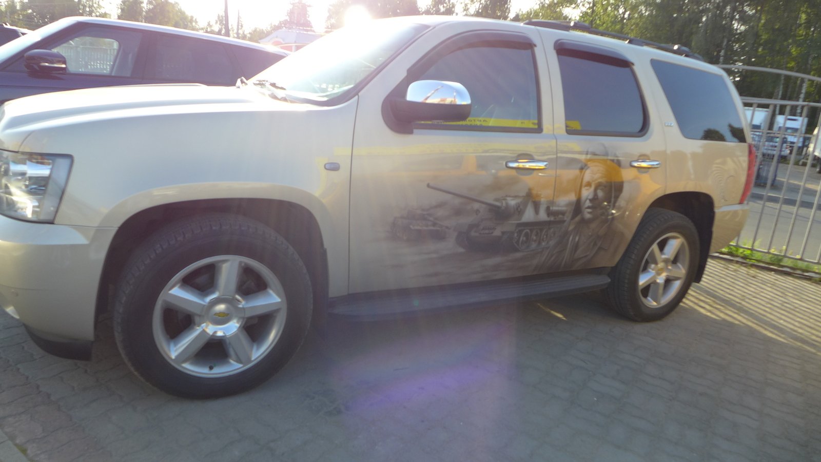 Элитная аэрография ручной работы на тему произведения Курочкина "На войне как на войне" на кузове люксового внедорожника Chevrolet Tahoe. Смысл проекта, скорее всего, соотносится с утверждением о том, что "танки грязи не боятся!"