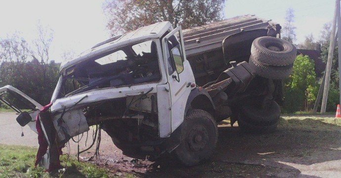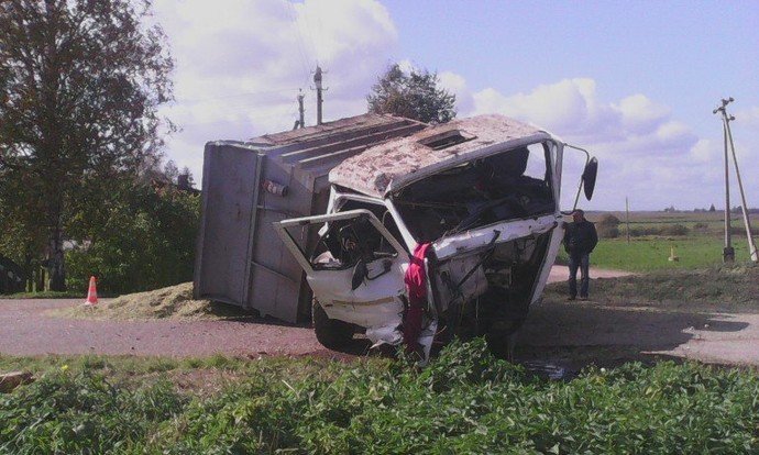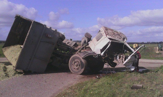 Перевозивший около 15 тонн корнеплодов большегруз мощнейшим ударом развернул самосвал в обратную сторону, и большая часть силосной массы высыпалась на асфальт. Корпус согнуло так, что правые колеса задней оси остались на проезжей части, а левые оказались над нею. Неестественное положение в итоге принял и водитель. Перед глазами очевидцев он предстал зацепившимся за кузов ногами и повисшим через пассажирскую сторону вниз головой. В тяжелом состоянии его доставили на лечение в областной центр.