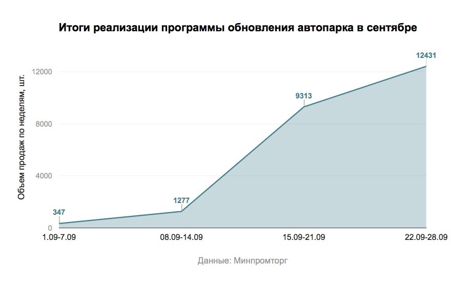 Основные продажи пришлись на четвертую неделю – 53% (12,4 тыс. штук) соответственно, свидетельствуют данные министерства. Чиновники министерства рассчитывают выйти на 15 000 машин в неделю в ближайшее время, сказал его представитель.