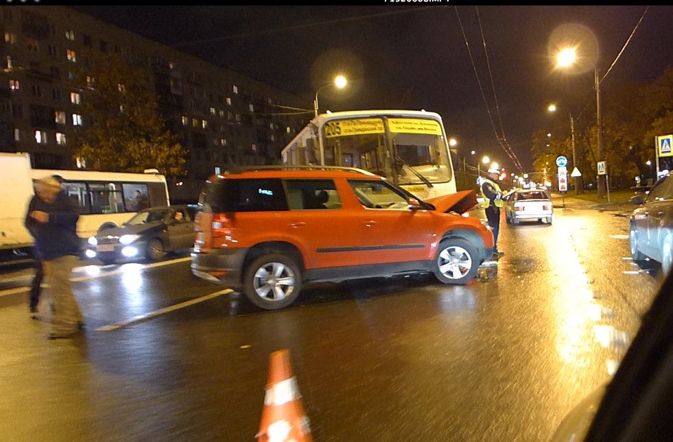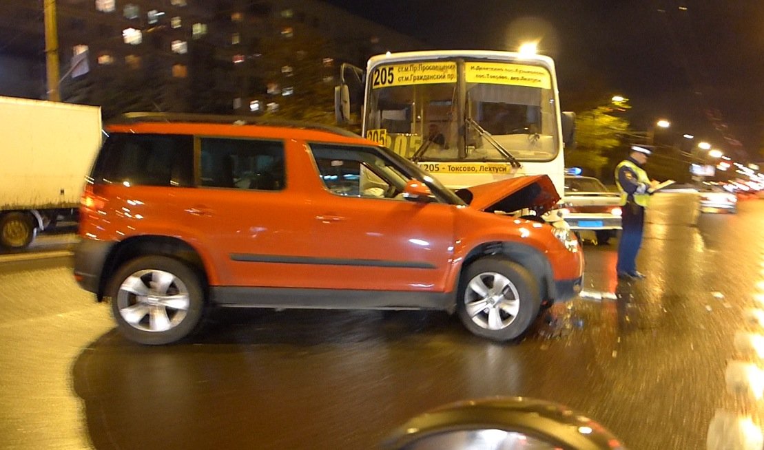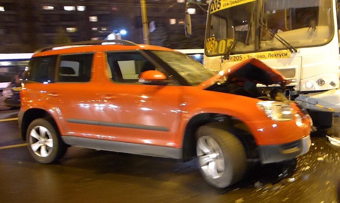 Причем лобовое стекло "Шкоды" с пассажирской стороны имеет характерные повреждения, очень похожие на те, которые появляются вследствие наезда на пещехода и "поднятия его на капот". Возможно в аварии поучаствовал пешеход, перебегавший проспект (отчего и маневр автобуса - попытка избежать наезда) а затем сбитый Шкодой. На месте пожарные, полиция, МЧС и машина реанимации. Подробности неизвестны. На месте ДТП образовался сильный затор движения транспорта по проспекту Мориса ТОрезва в сторону Светлановского проспекта.