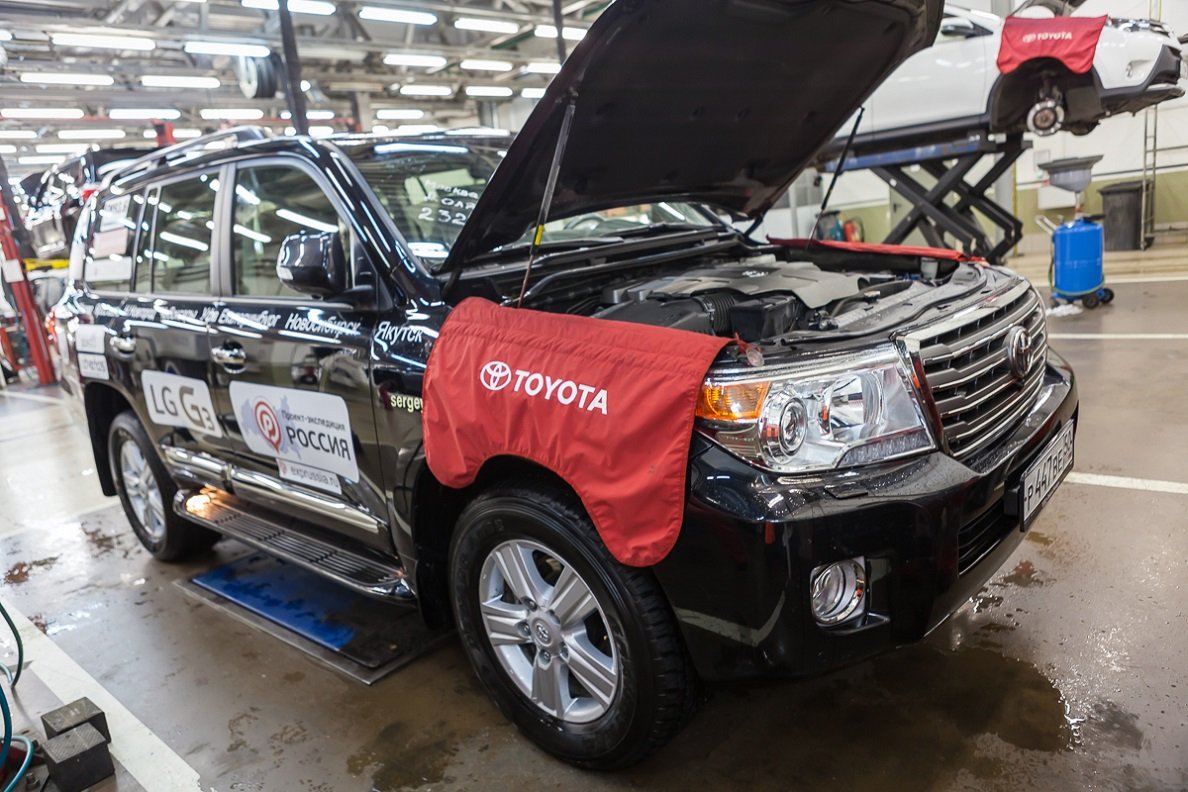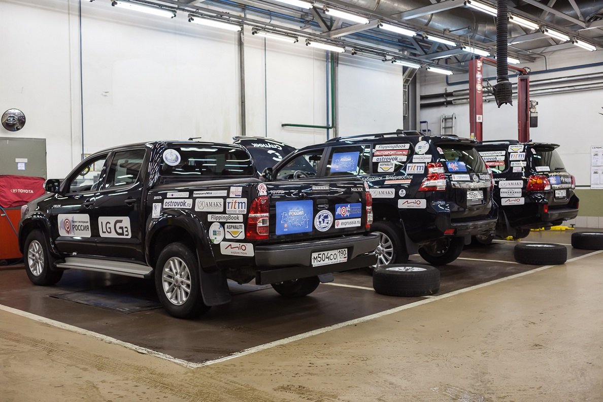 Помимо технической диагностики после завершения проекта, автомобили Toyota Land Cruiser Prado, Land Cruiser 200 и Hilux во время экспедиции «Россия» прошли процедуру регулярного ТО в Тойота Центр Екатеринбург Юг и у уполномоченного партнера Тойота в Чите. Ремонт по итогам небольшого ДТП на маршруте производился силами Тойота Центр Омск.