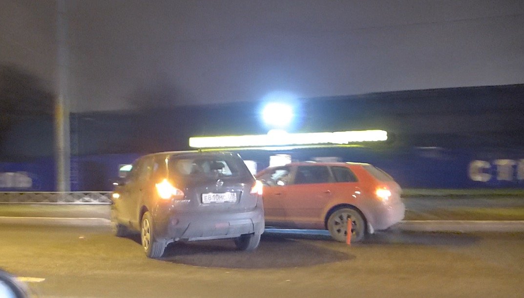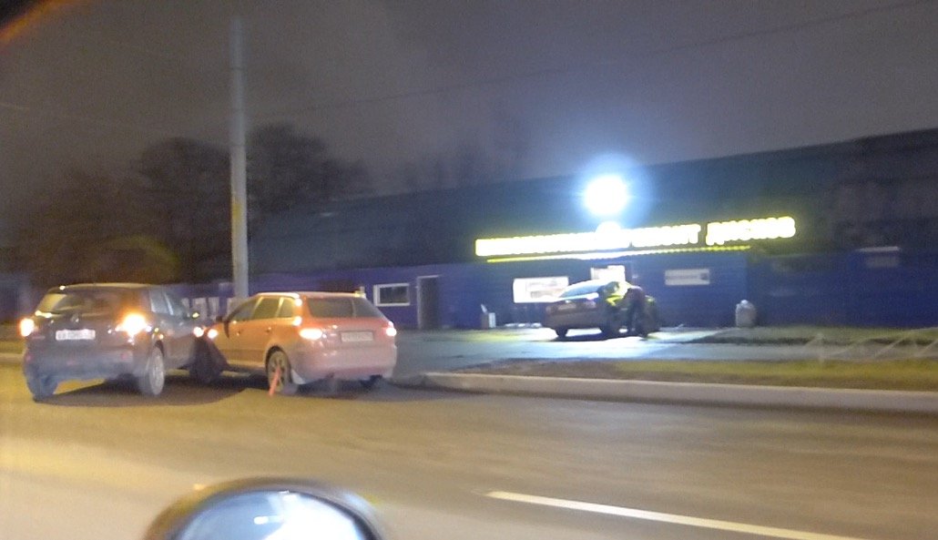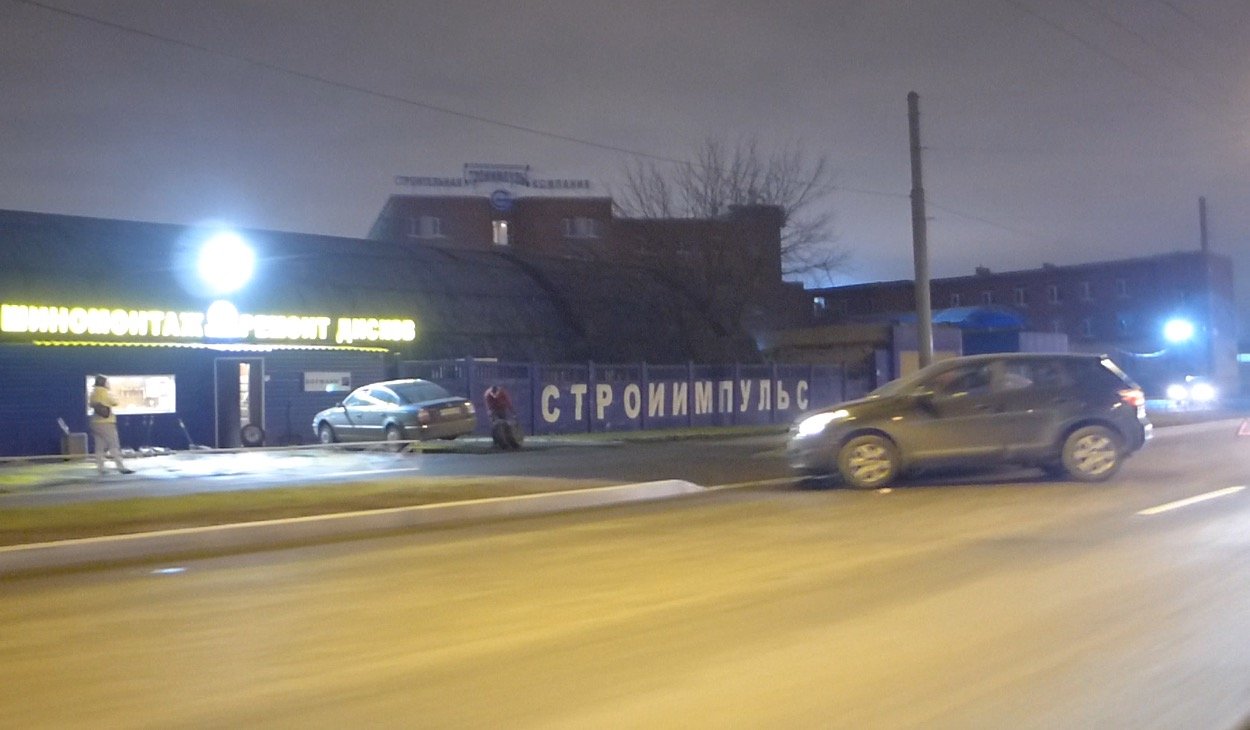 Водитель кроссовера Nissan Qashqai попытался заехать к шиномотнажному сервису, но не убедился в безопасности такого маневра - в результате "Ниссан" навалился на ехавший здесь в правом ряду автомобиль Audi A3. Хотя, может быть, оба водителя пытались заехать сюда первыми?