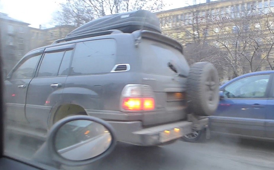 Далее видим на видеозаписи как водитель Лексуса трогается с места и выламывает бампером водительскую дверь Ниссана в обратную сторону, а водитель Ниссана, в свою очередь выходит из машины, поднимает обломок бампера лексуса? и с силой бросает его в заднее стекло внедорожника, пробивая этим предметом в стекле большую дыру. Примечательно, что конфликт происходит на галазах многочисленных ничего не понимающих прохожих и при участии пассажирки Ниссана с грудным ребенком на руках. Как видно далее по сюжету, скорее всего в Ниссане ехала супуржеская пара с двумя грудными детишками.