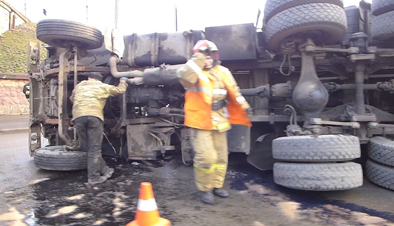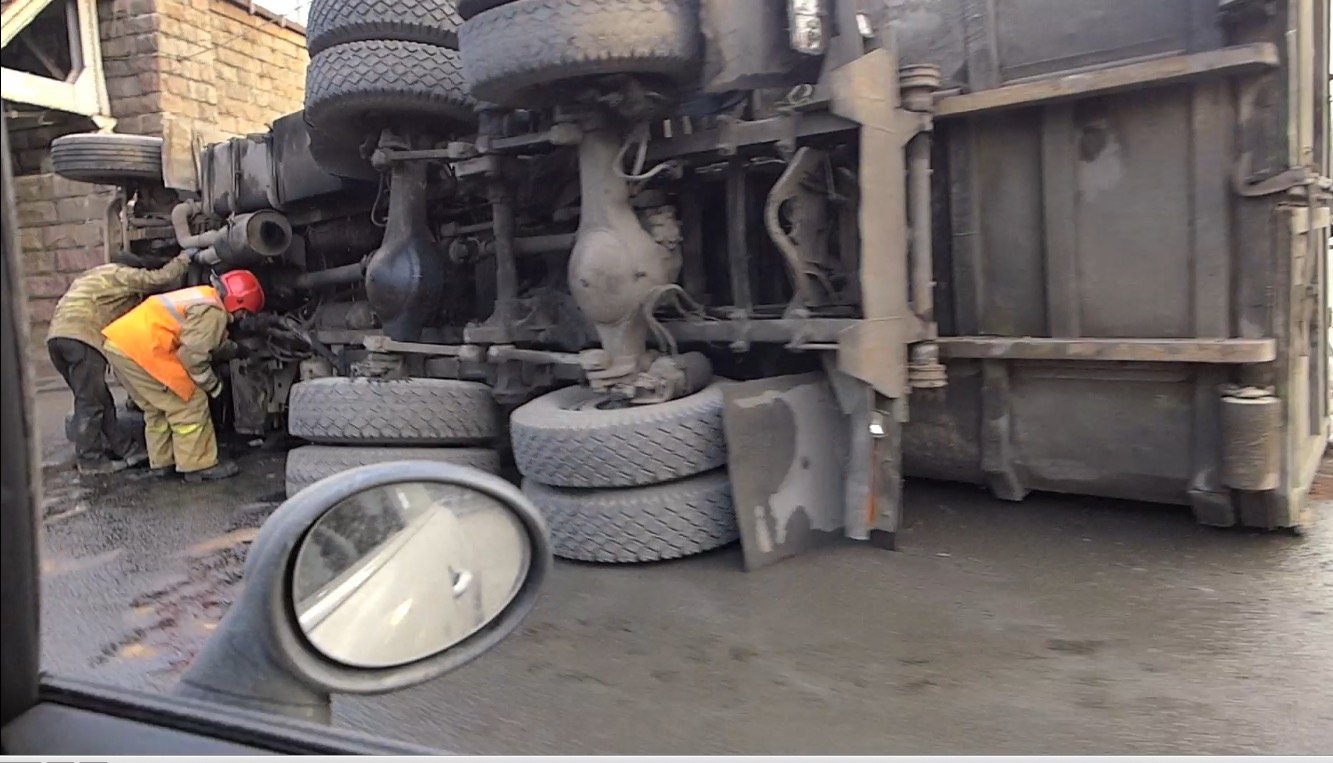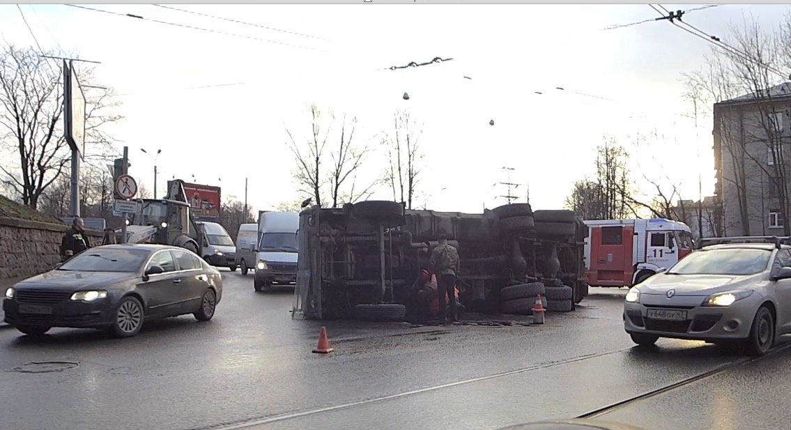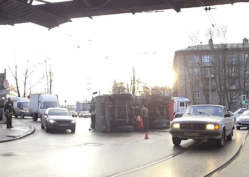 Неудачный маневр правого поворота с Полюстровского проспекта на Политехническую улицу у Кушелевского железнодорожного моста привел к опрокидыванию грузовика-мусороза. Как это всегда и бывает, произошел разлив топлива из бака самосвала. На место аварии оперативно прибыли пожарные и мчс. По счастью падающий набок грузовик никого не придавил.