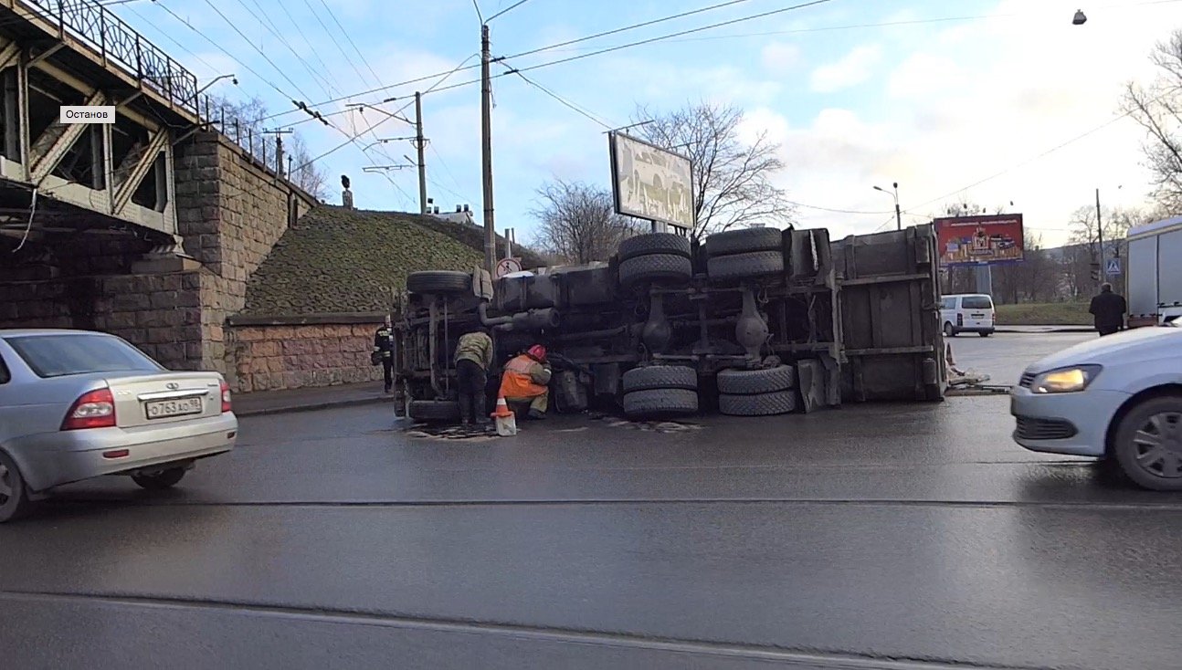 В Петербурге под Кушелевским ж/д мостом опрокинулся мусоровоз