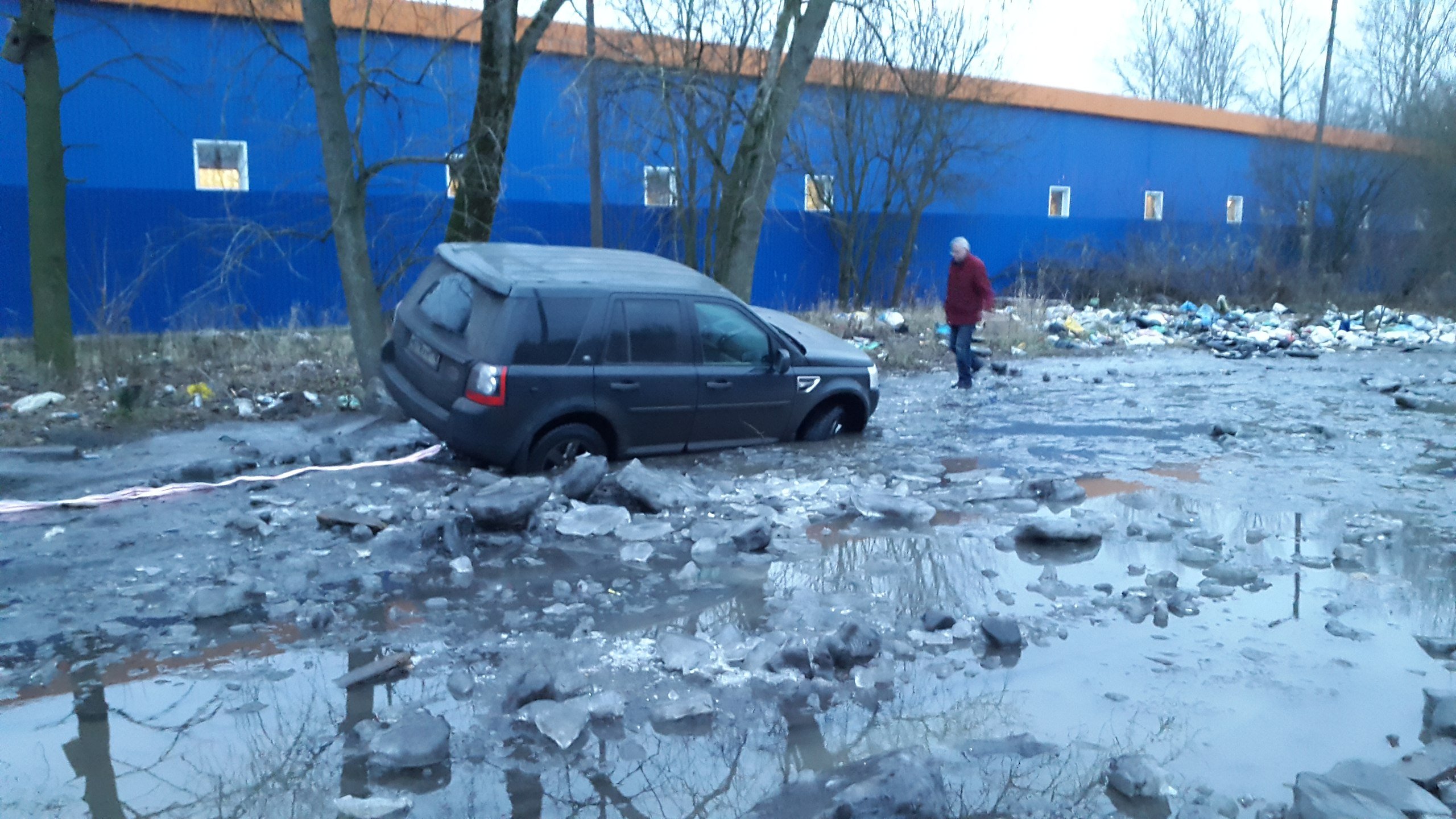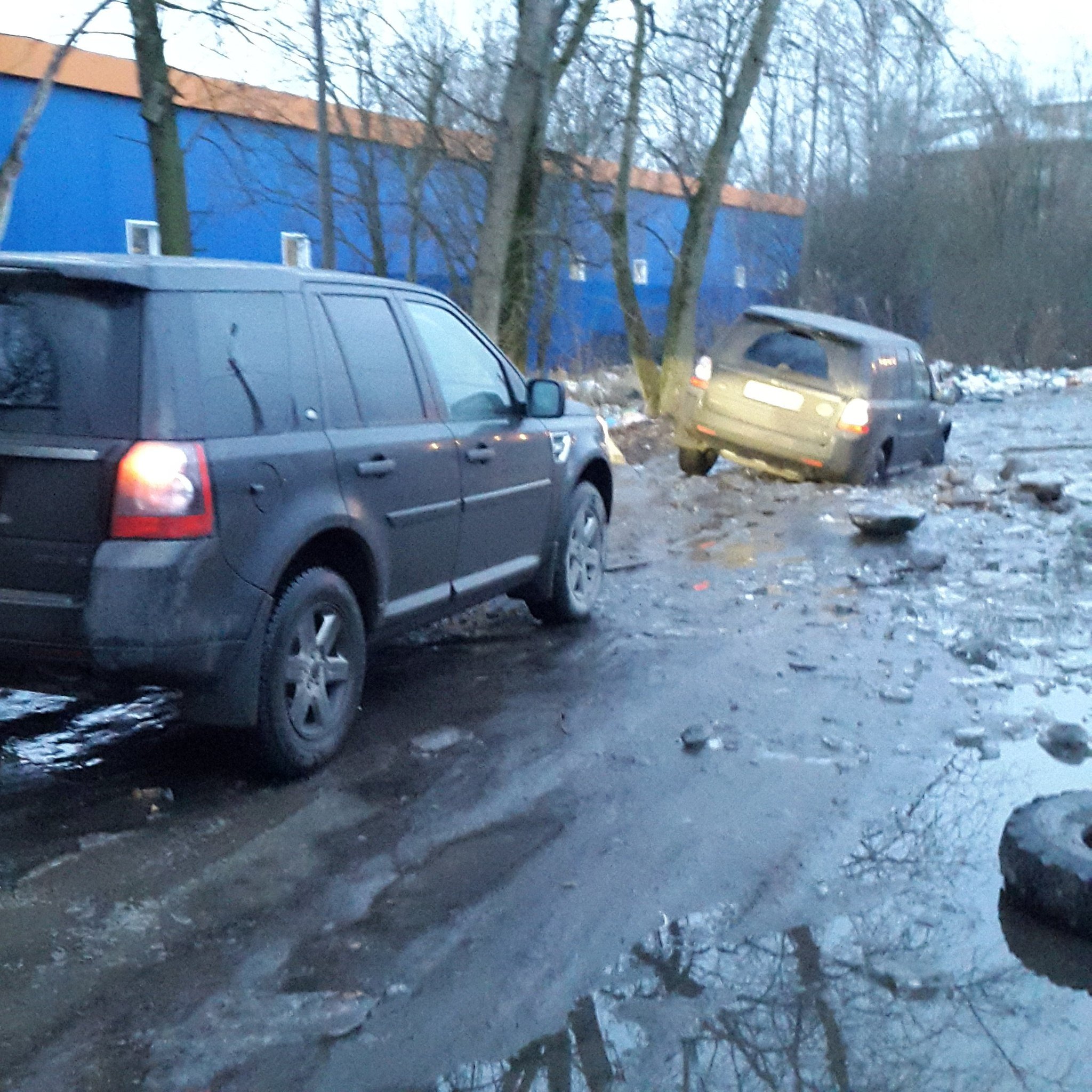 Езда по навигатору с препятствиями - город Колпино, улица Промышленная. Попытка объехать пробку следуя указаниям навигационной GPS системы не удалась. Кроссовер Лэнд Ровер заехал в ледяную лужу с скользкими берегами и выехать оттуда самостоятельно не смог. Водителю пришлось вызывать на подмогу такой же внедорожник, который на буксире вытащил застрявший Freelander из западни.