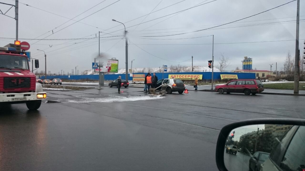 Необычные дорожное происшествие произошло на пересечении проспекта маршала Жукова и маршала Казакова. Столб буквально пронзил автомобиль volkswagen golf упав на него.