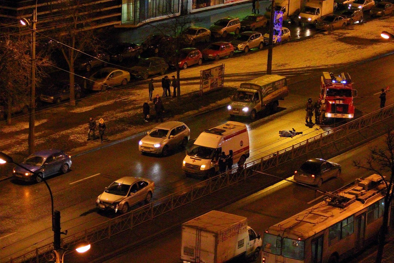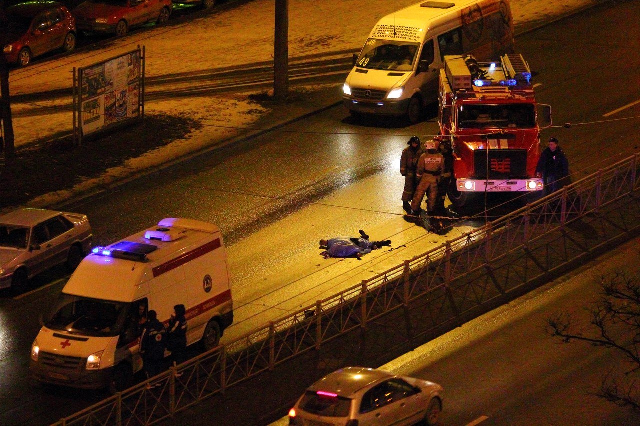 Жуткое зрелище наблюдается сейчас на улице Народной, д. 100. Насмерть сбитый пешеход, перебегавший улицу в неположенном месте, до сих пор лежит на проезжей части накрытый брезентом. Работают службы пожарной и скорой помощи.