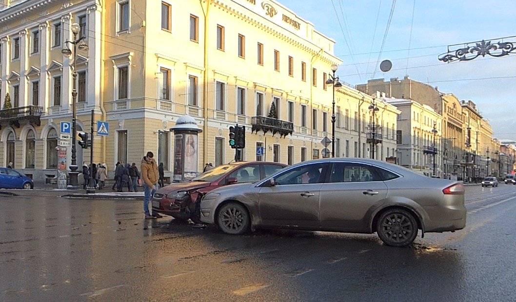 ДТП на Невском проспекте: водитель выезжающего с Перинной линии седана Ford Mondeo по непонятной причине не заметил ехавший по Невскому проспекту здесь-же хэтчбэк Ford Focus. Очередная нелепая и безуспешная попытка "успеть проскочить!"