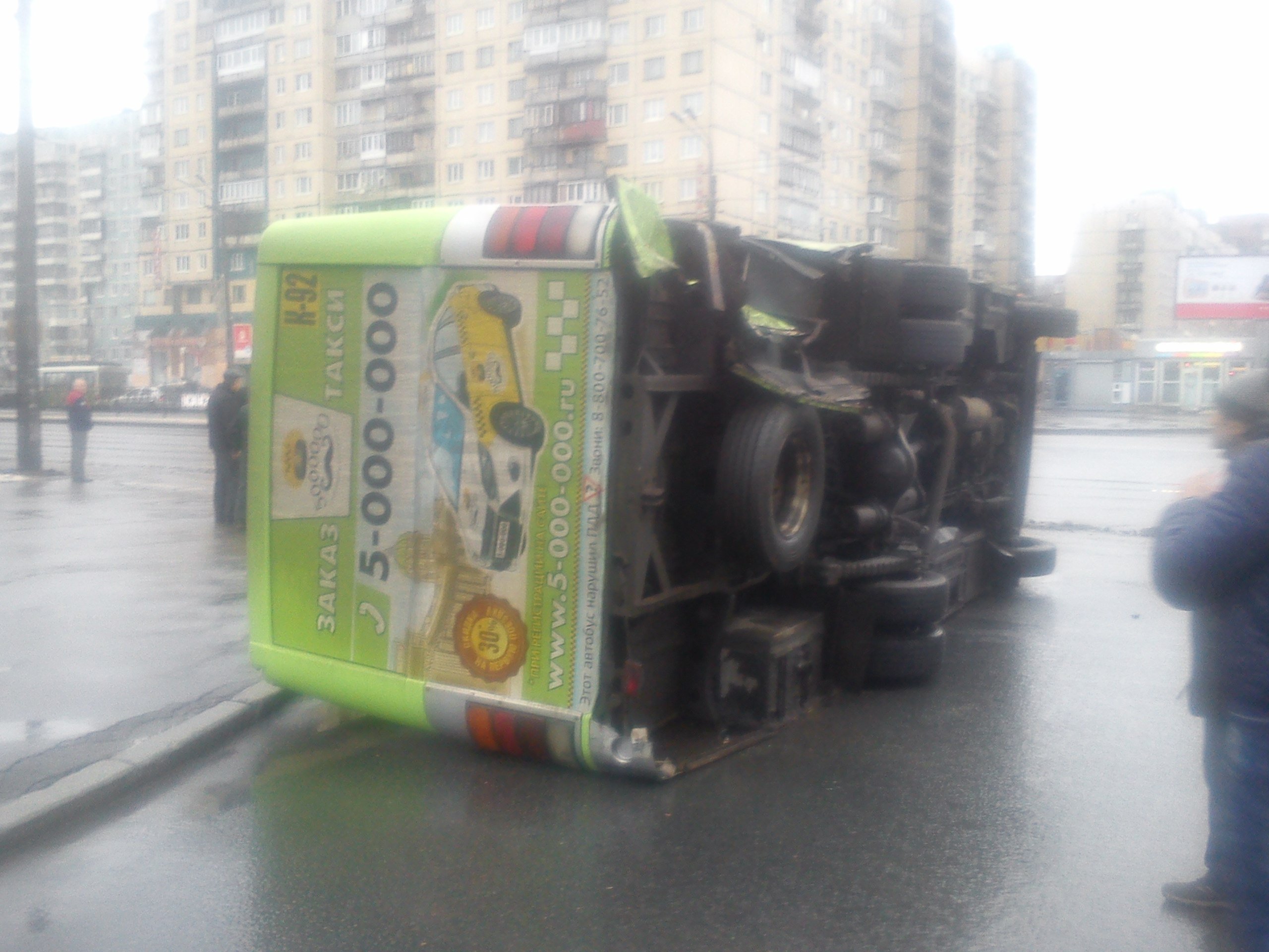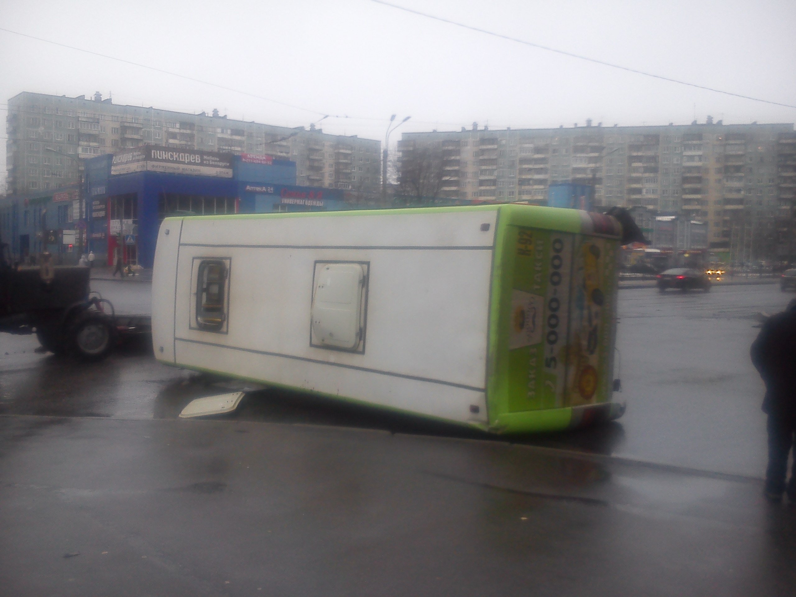 На проспекте Ударников в Красногвардейском районе Петербурга в результате столкновения легкового автомобиля Hyundai с с пассажирским микроавтобусом 92-го маршрута последний опрокинулся на левый бок. Судя по свежим повреждения правого борта микроавтобуса, удар пришелся в заднюю правую часть кузова и оказался достаточной силы для потери устойчивости автобусом.