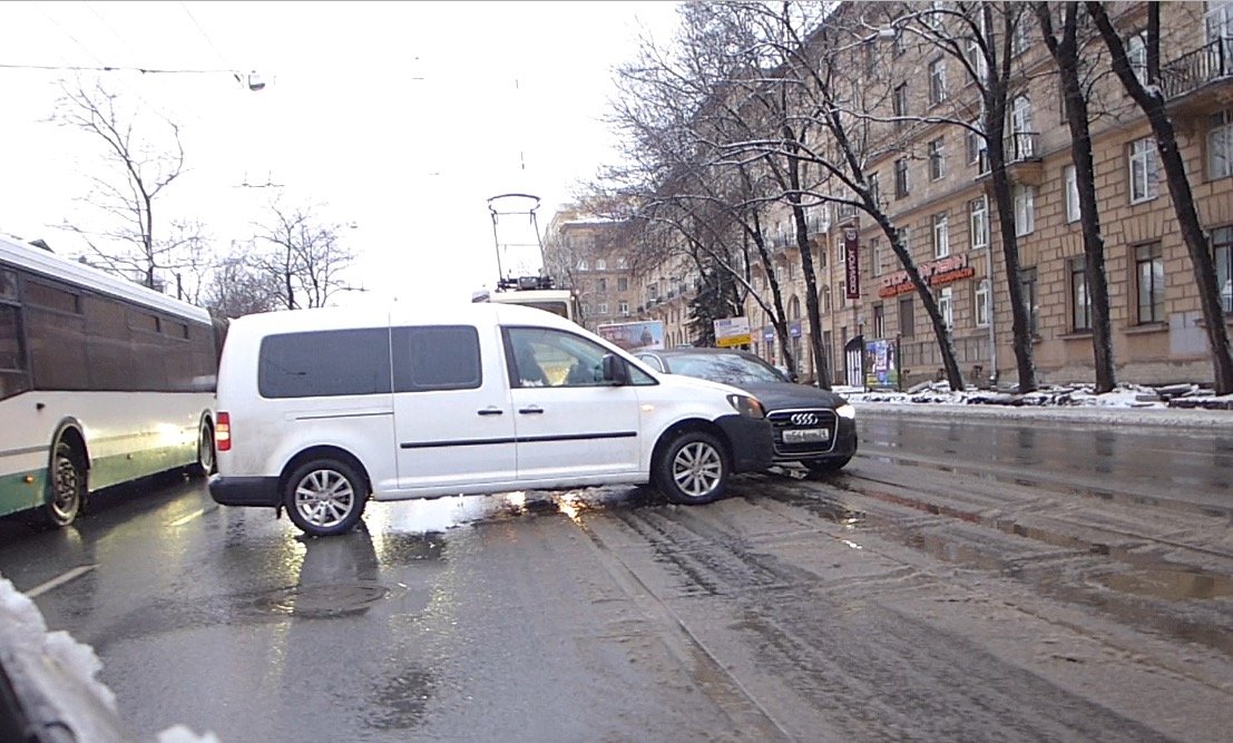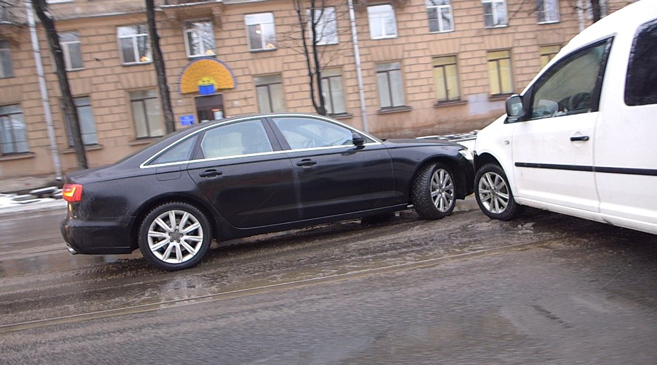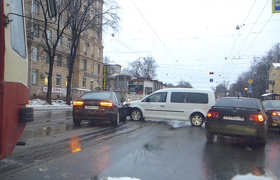 Очередное столкновение на трамвайных рельсах на проспекте Энгельса собрало большую пробку по направлению движения к центру город от Выборгского района. Пострадавших нет. Ситуация, к сожалению, банальна до крайности: водитель фургона Volkswagen Caddy, вместо того, что бы безопасно повернуть направо и потом развернуться, предпринимает попытку левого поворота через все полосы движения и сталкивается с едущим по трамвайным рельсам автомобилем Audi.