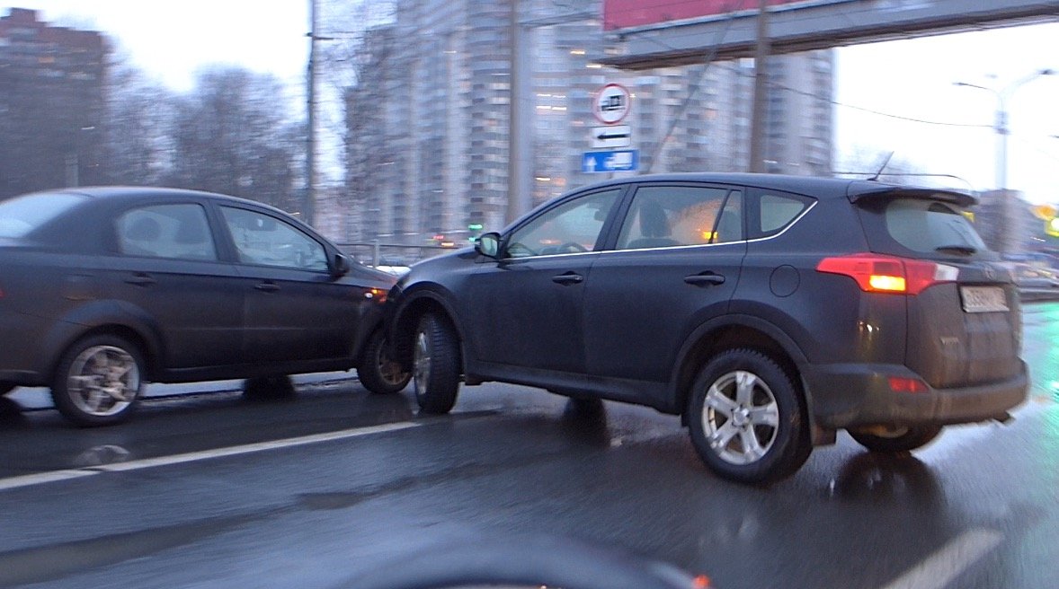 Весьма забавную аварию можно было наблюдать вечером 17 января на улице Руставели напротив гипермаркета Карусель. Новенький кроссовер Toyota RAV4, выезжая с парковки, не сумел правильно рассчитать траекторию правого поворота, и врезался в проезжавший здесь автомобиль "Шевроле Авео". В аварии никто не пострадал, однако, аварийные автомобили перекрыли две полосы движения по улице Руставели.