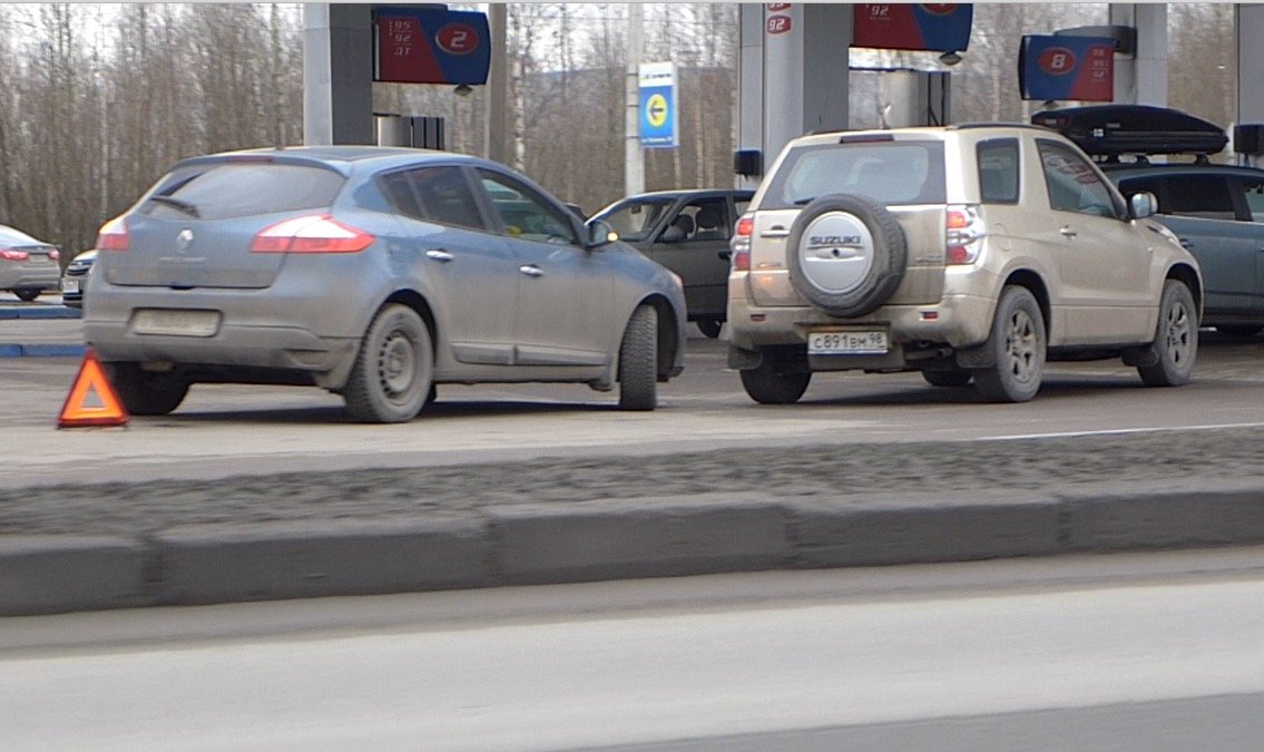 Кто первый успеет к заправочному пистолету? Не всегда в таких гонках бывают победители - яркий пример спешки на АЗС в этом сюжете. Водители автомобилей Suzuki Vitara и Renault Megane не поняли маневр друг-друга и несильно столкнулись прямо на территории топливно-запровочной станции.