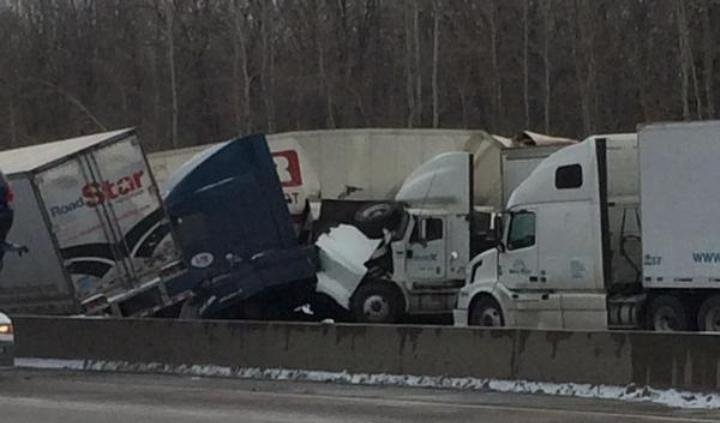Среди 50 грузовиков 33 были с прицепом.Полиция вынуждена была закрыть весь участок шоссе от County Road 30 до Wallbridge Loyalist Rd.