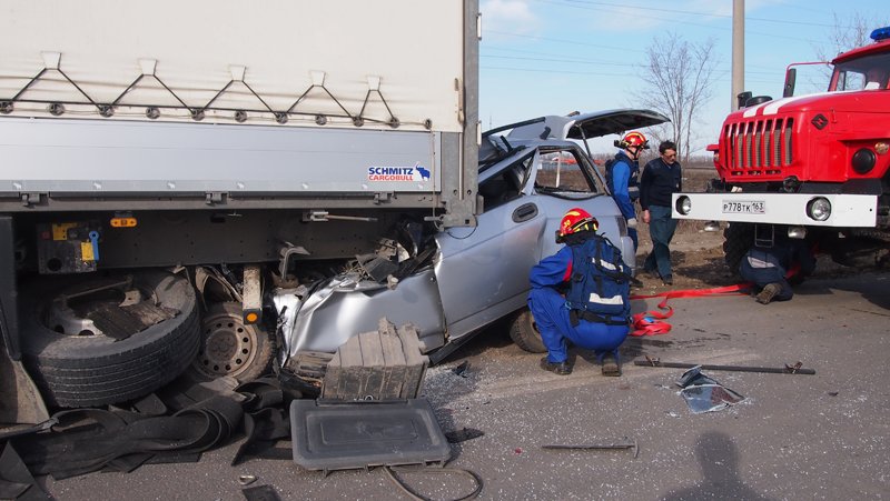 36-летний водитель автомобиля ВАЗ-2111, двигаясь со стороны Нефтегорска, столкнулся с ехавшим в попутном направлении грузовым автомобилем DAF с полуприцепом. От сильного удара легковой автомобиль практически наполовину вошел под полуприцеп грузовика. У водителя и пассажиров не было никаких шансов на выживание. Водитель ВАЗа и два его пассажира 19 и 21 лет скончались на месте.