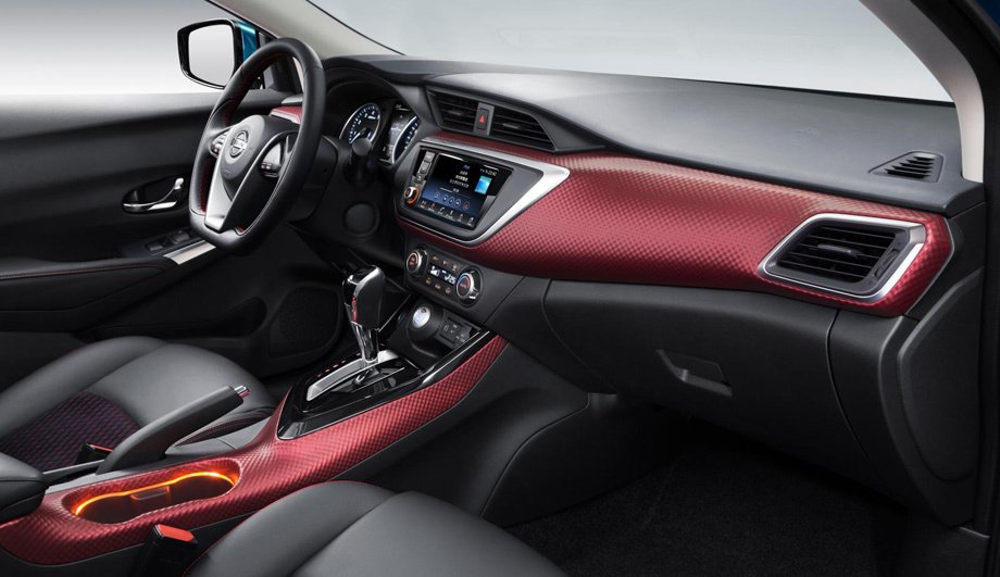 В салоне находится рулевое колесо с «плоским дном», кожаная отделка с контрастной строчкой, подсвечивающиеся держатели стаканов, информационно-развлекательную систему с 7-дюймовым монитором, красные и хромированные вставки.