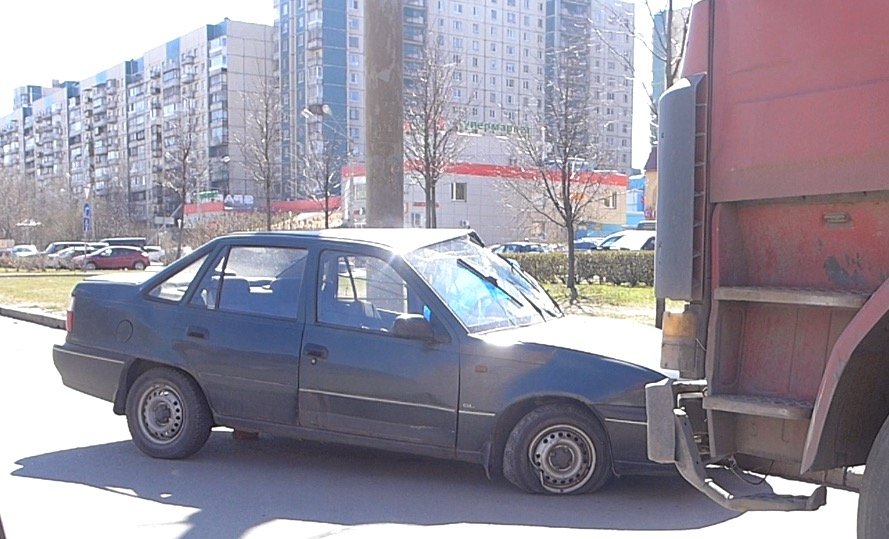 Разбитый седан Daewoo на Комендантском проспекте - последствия сильного удара в водительскую дверь машины. Подробности аварии неизвестны. Надеемся, что люди остались в живых.