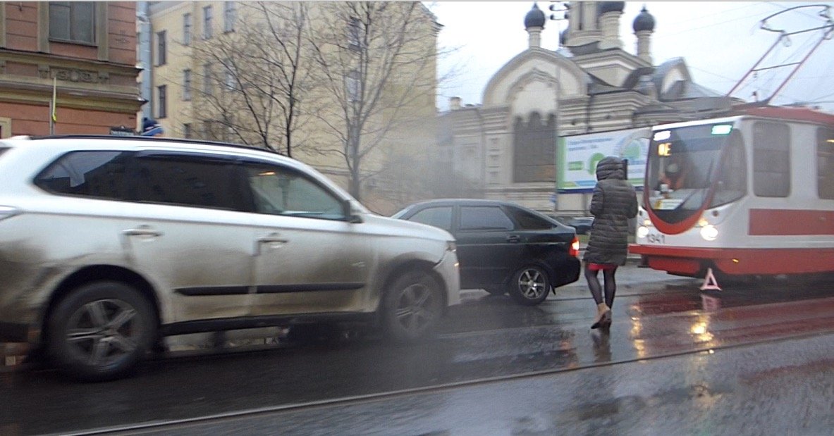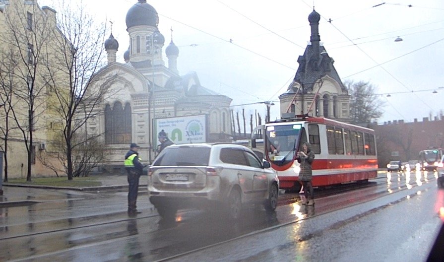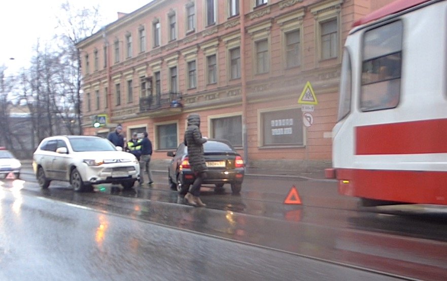 ДТП на трамвайных путях случилось вечером в воскресенье на Старо-Петергофском проспекте у поворота на Нарвский проспект у церкви. По крайней мере в одном автомобиля, судя по всему , была девушка за рулем. "Митсубиши" врезался в заднее левое крыло "Лады", что вызывает некоторое недоумение маневром ВАЗа (возможно заканчивал разворот?).