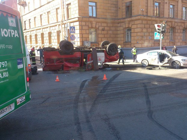 На Васильевском острове в Санкт-Петербурге на перекрестке Среднего проспекта и Гаванской улицы в результате ДТП перевернулась пожарная машина. Это случилось в результате столкновения с автомобилем Volkswagen Passat.