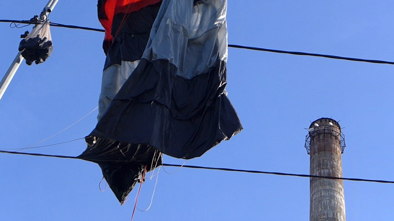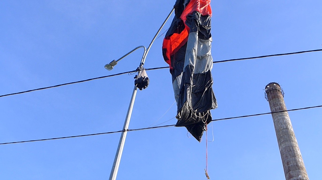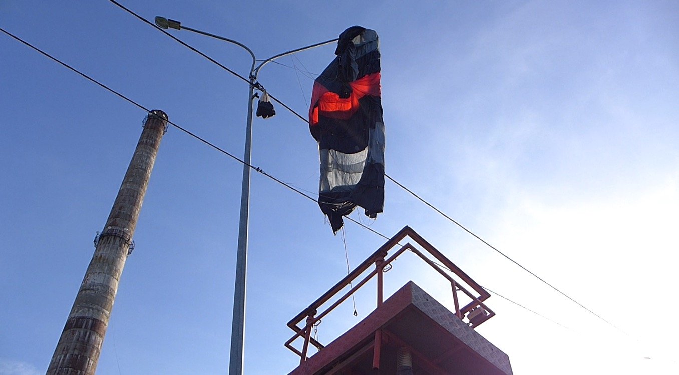 Парашютист-экстремал спрыгнул с трубы ТЭЦ на Суздальском проспекте и повис на фонарном столбе.