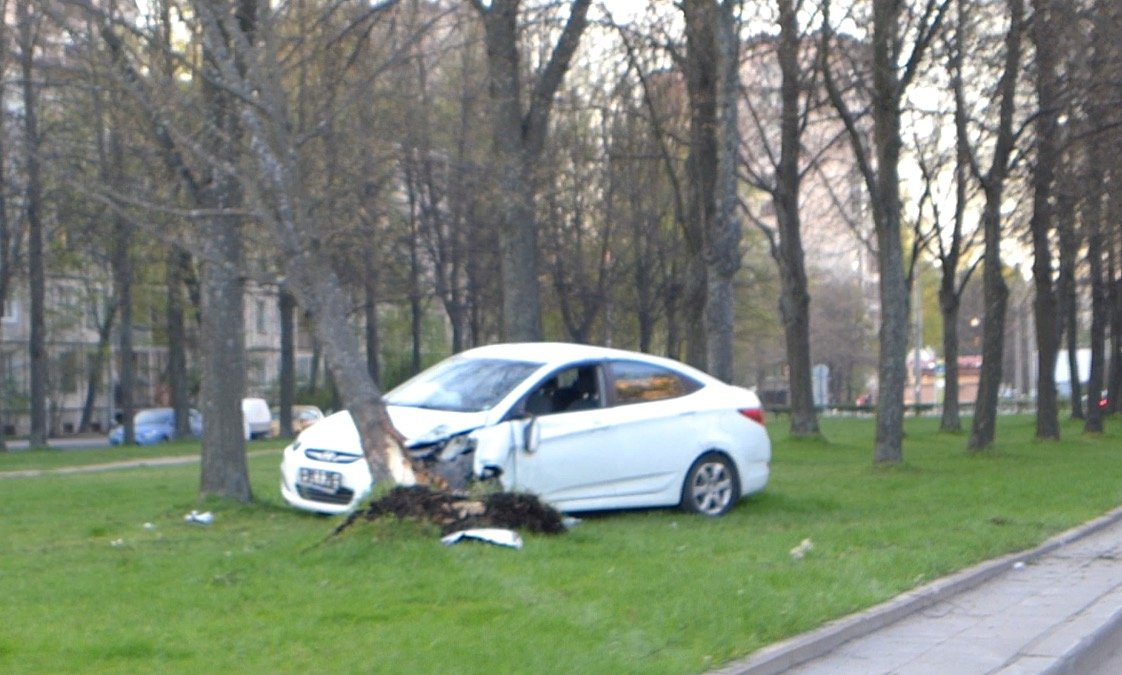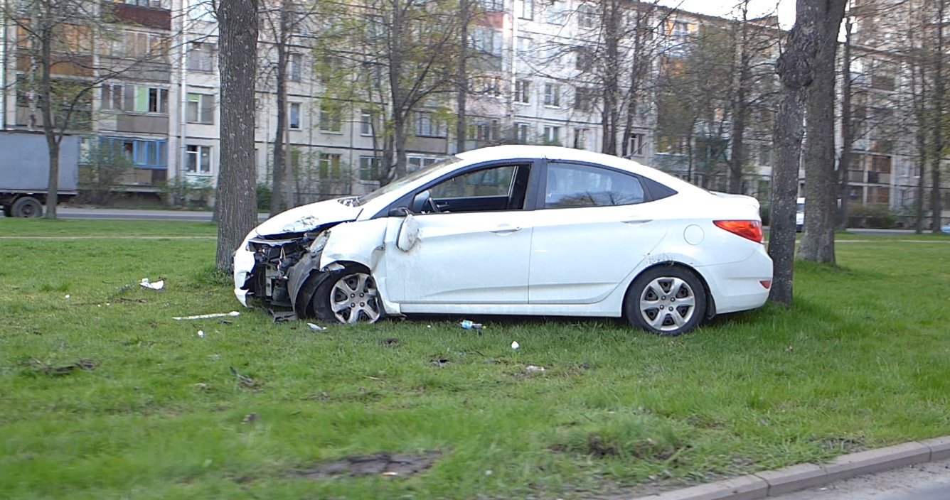 Hyundai Solaris вылетел на газон, перевернулся и врезался в дерево на улице Карпинского