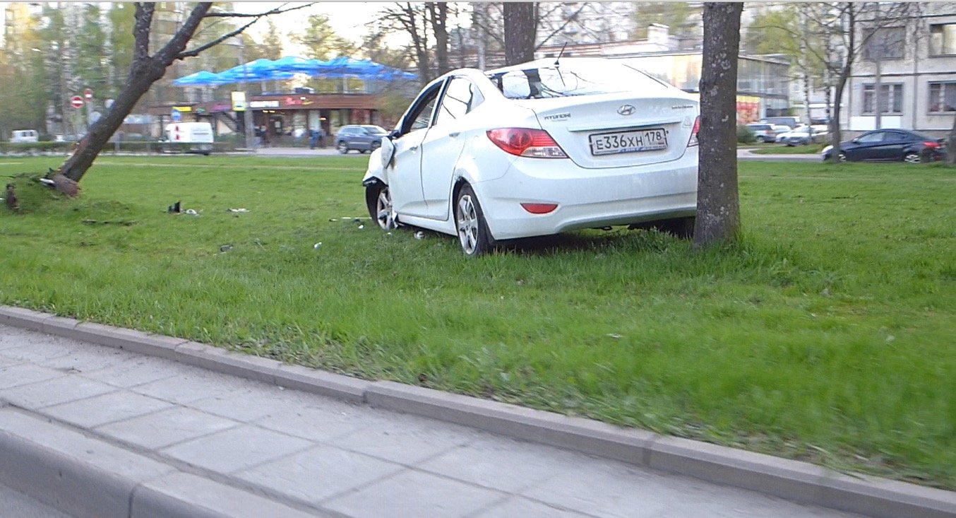 Неприятная авария с последствиями для кузова автомобиля Hyundai случилась на круговом движении на пересечении улиц Верности и Карпинского. По неизвестным обстоятельствам водитель (водительница?) иномарки не справился с управлением, опрокинулся через крышу и выехал на газон, где совершил наезд на препятствие - дерево.