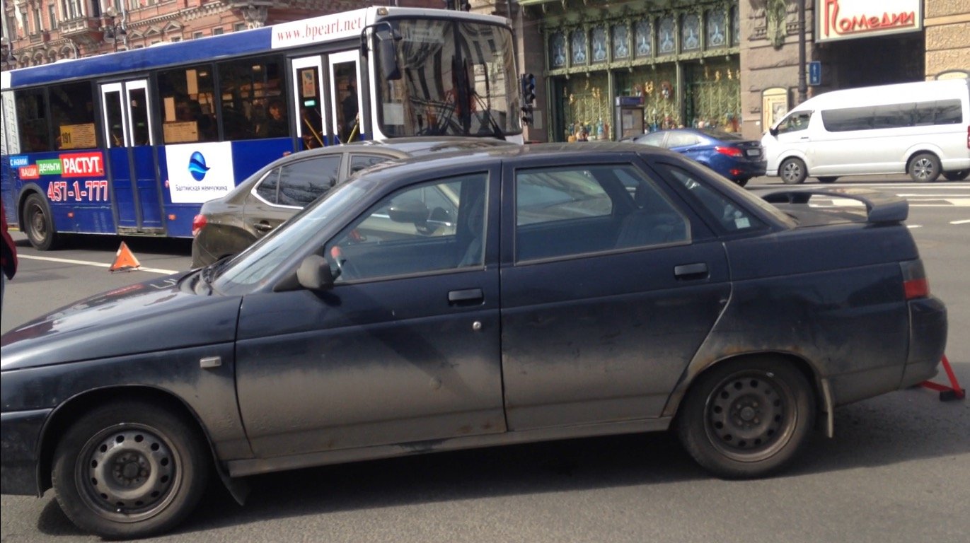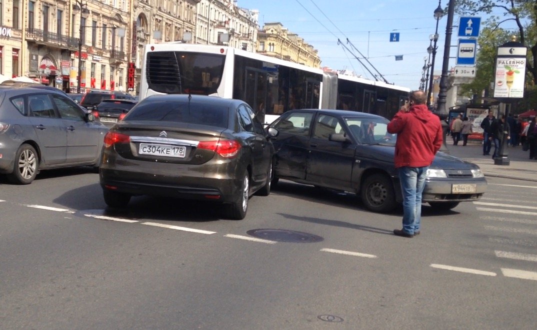 На полосе движения общественного транспорта на Невском проспекте произошло ДТП с участием автомобилей ВАЗ ЛАДА и Citroen. По информации водителя ВАЗа, молодой человек за рулем седана Ситроен решил успеть проскочить перед ним на запрещающий сигнал светофора (для водителя ВАЗа горел сигнал стрелки левого поворота к площади Островского). Ситроен сильно врезался в правый борт кузова Лады, повредив саму дверь и дверную стойку правой задней двери.