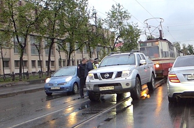 Вечером в четверг на Лесном проспекте на трамвайных путях произошло происшествие, скорее напоминающее некий конфликт водителей на дороге, чем обычное ДТП. На месте можно было видеть машину ОМОНА и несколько патрульных экипажей полиции. На трамвайных путях стоял пикап Nissan Navara, мешающий движению трамваев.