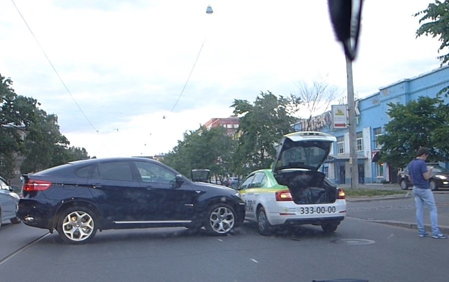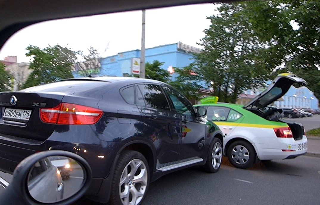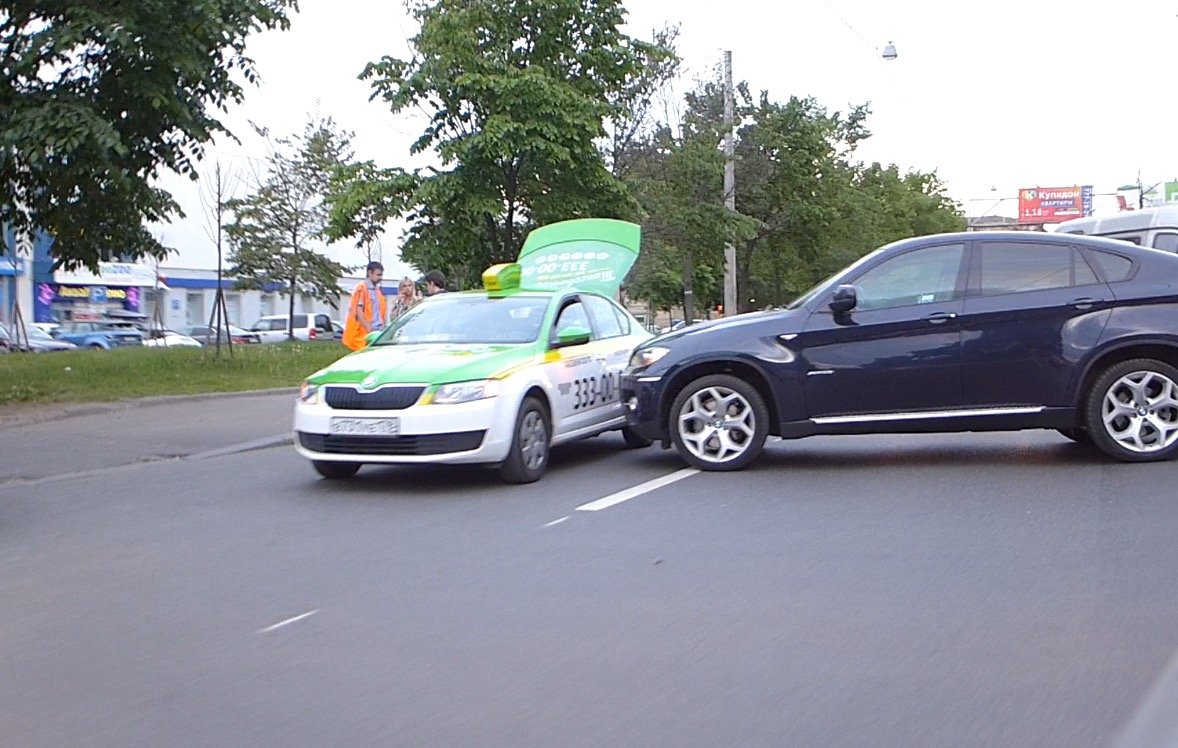 Нелепое ДТП на проспекте Энгельса напротив супер-маркета Перекресток неподалеку от Светлановской площади случилось вечером вторника 9 июня 2015 года. Таксит, управляя автомобилем Шкода, патриотически не пропустил разворачивающийся здесь буржуазный и очень дорогой внедорожник от BMW.