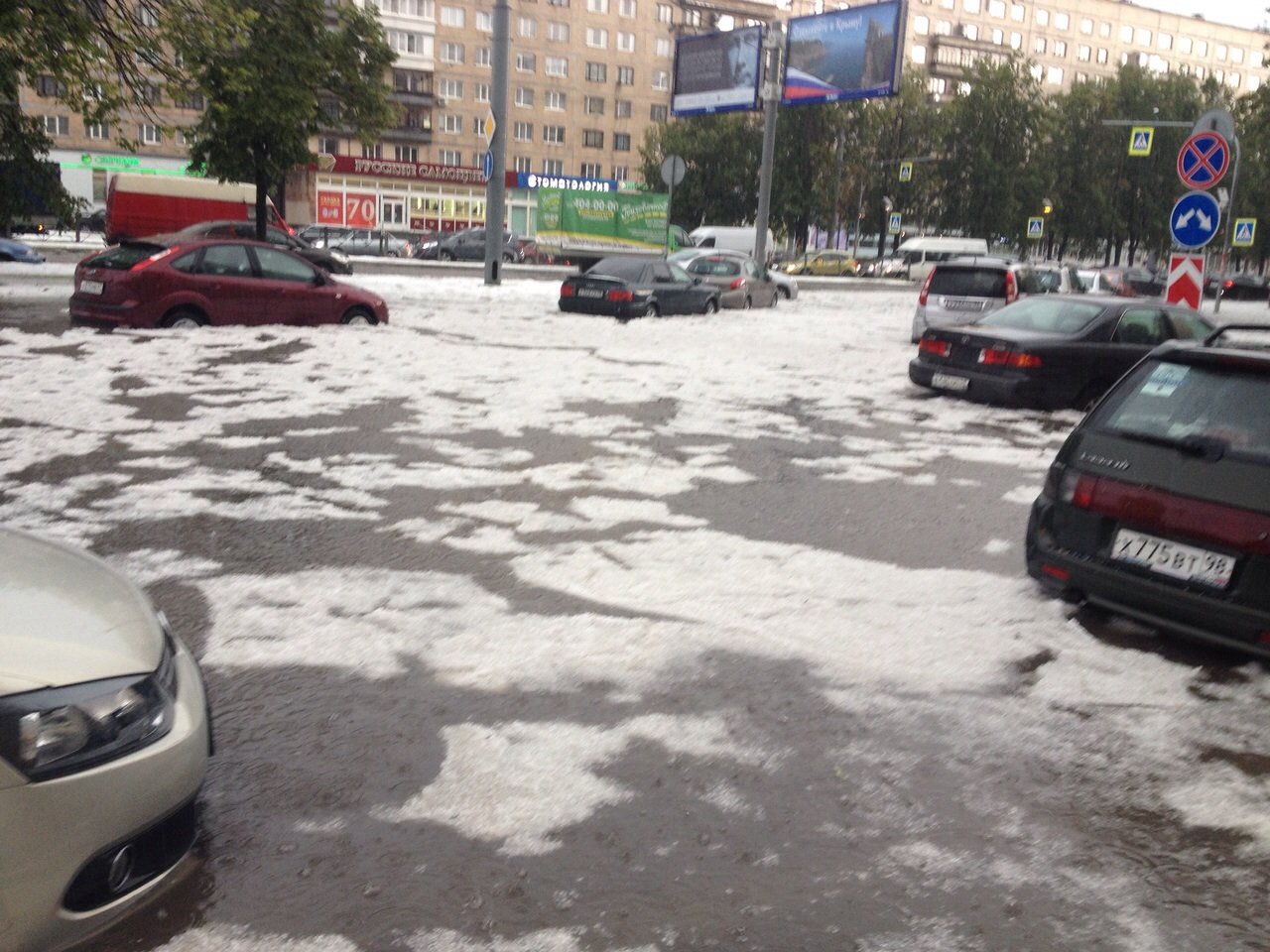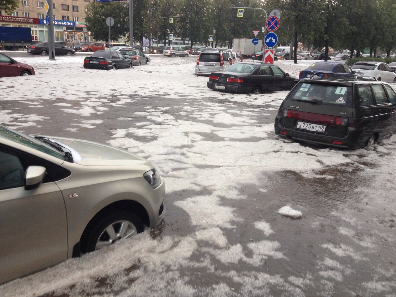 Град и дождевое наводнение в Петербурге вызвало подтопление основных магистралей.