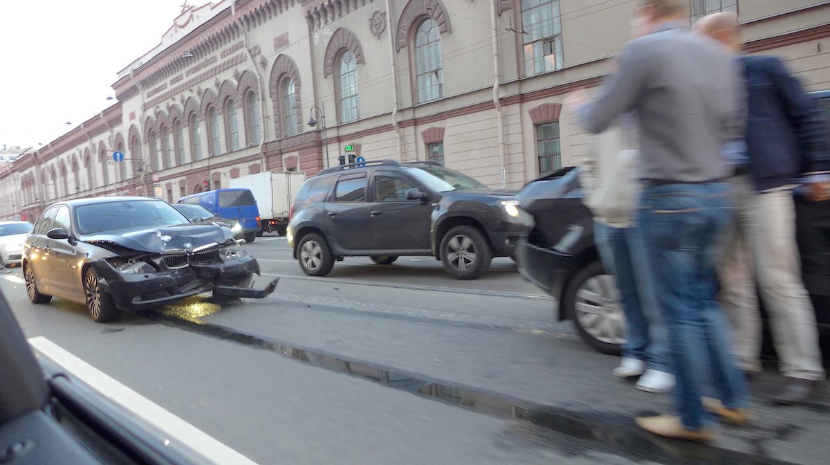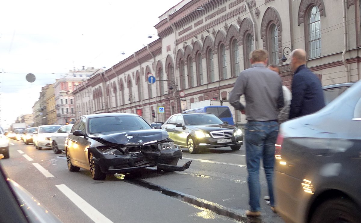 Авария на Литейном проспекте - водитель седана BMW пятой серии не успел затормозить и сильно врезался в заднюю часть ехавшей перед ним иномарки, которая сбросила скорость и начала торможение перед зоной пешеходного перехода.