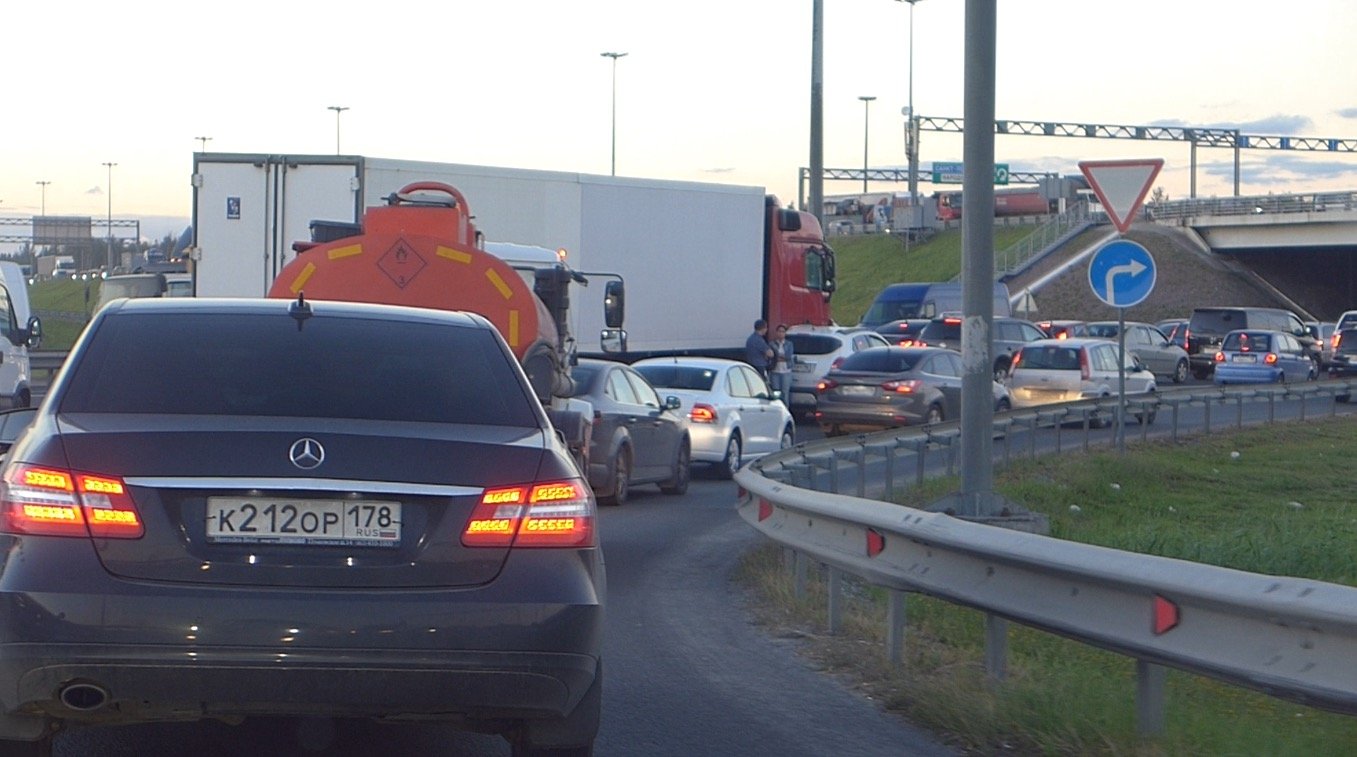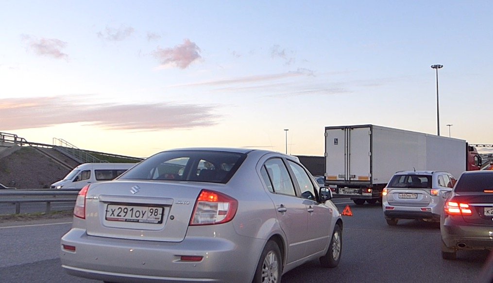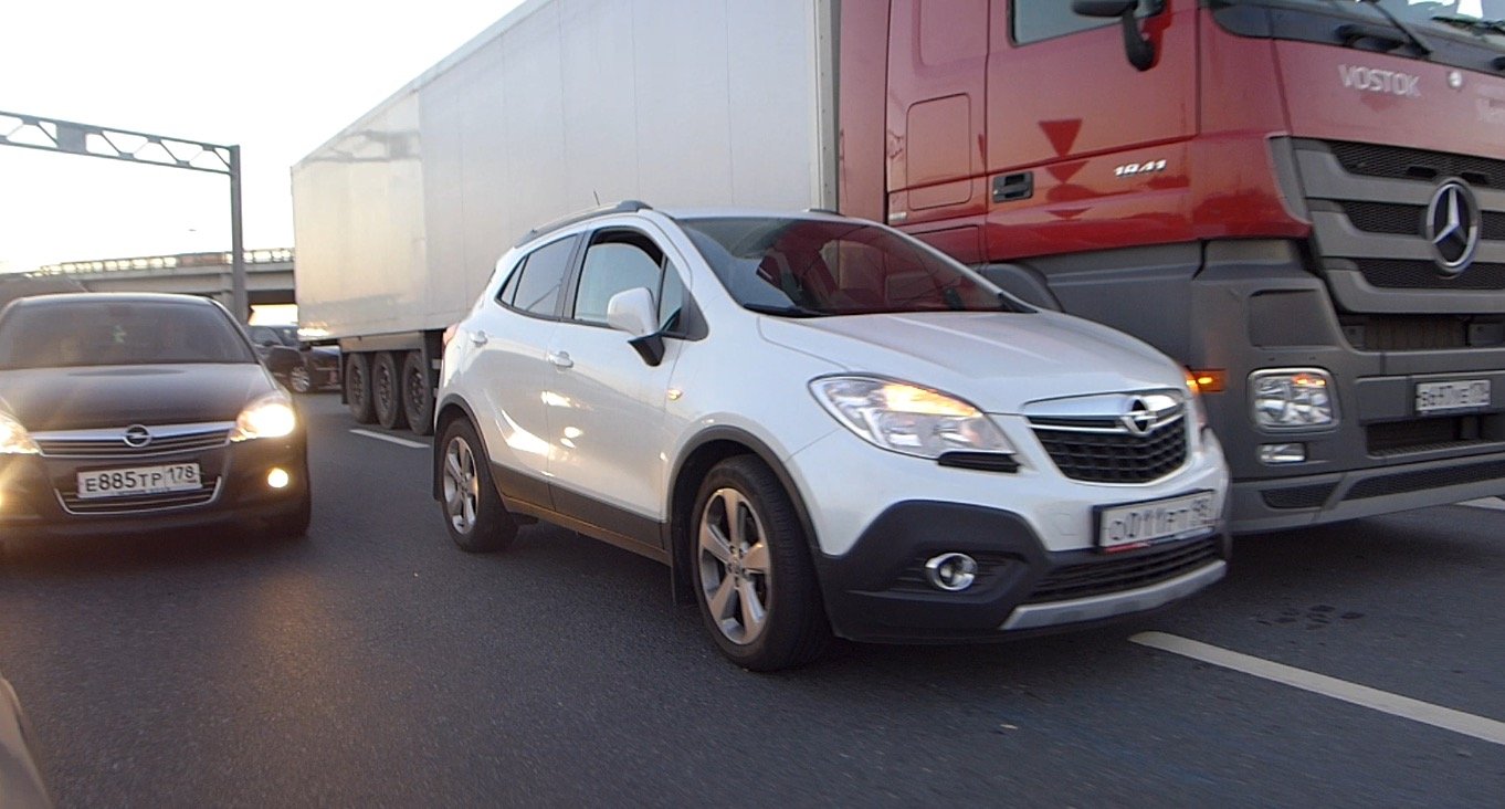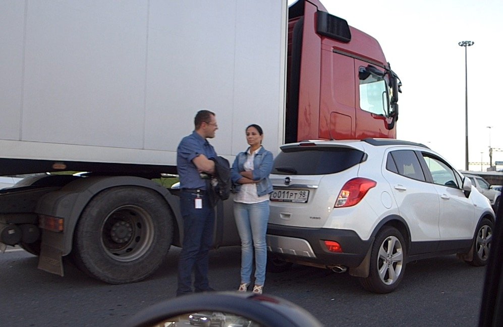 Девушка, управляя кроссовером Opel Mokka, съехав по развяке с Кольцевой автодороги на Мурманское шоссе при перестроении из полосы в полосу допустила боковое столкновение с ехавшим из Петербурга тягачом Mercedes Benz.