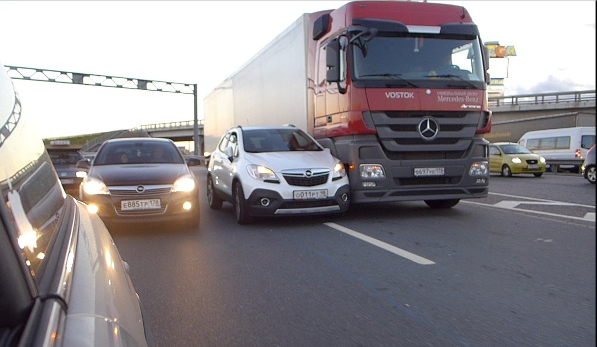 На съезде с Кольцевой на Мурманское шоссе грузовик навалился на маленький кроссовер Opel