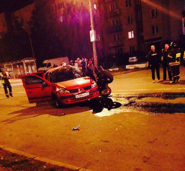 Легковой автомобиль Renault лоб в лоб протаранил мотоцикл, на котором ехали два человека. Предполагается, что иномарка выезжала со двора и не пропустила мотоциклиста.