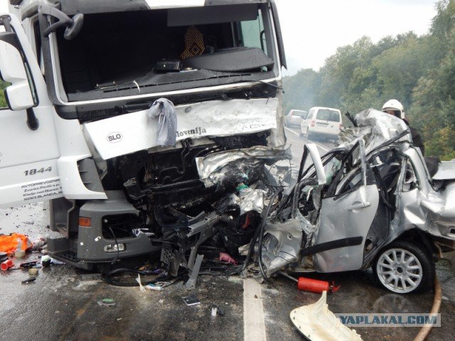 Водитель автомобиля Lada Granta, совершая обгон попутного автомобиля, выехал на полосу встречного движения, где лоб в лоб столкнулся со фурой Mercedes-Benz Actros под управлением жителя Словении. Удар был такой силы, что легковушку смяло до задних сидений.