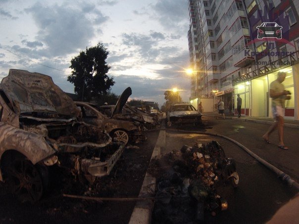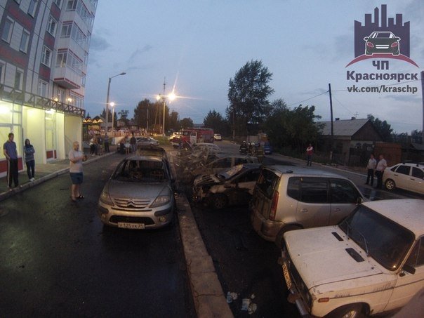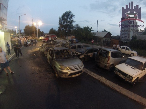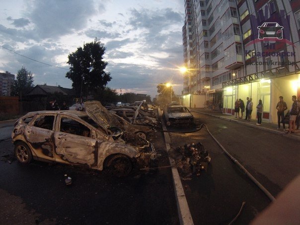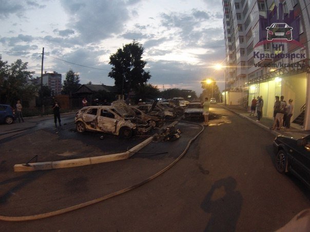 В ночь на 22 августа в Красноярске на одной из парковок дотла сгорели семь автомобилей.
