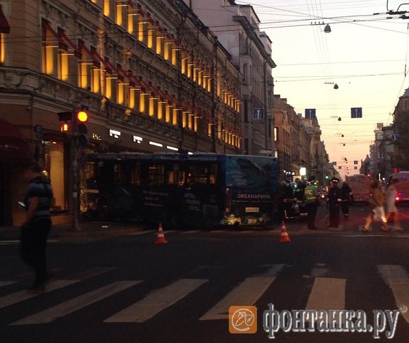 По предварительной информации, автобус, следовавший по маршруту №191, попытался проскочить перекресток на красный свет светофора, но столкнулся с маршруткой №369 и вылетел на тротуар, где и врезался в витрину магазина.